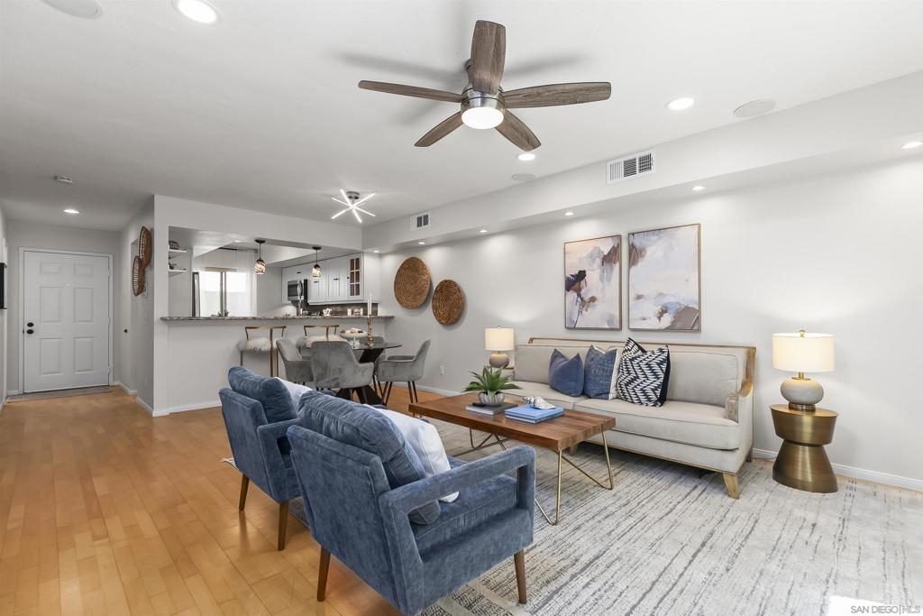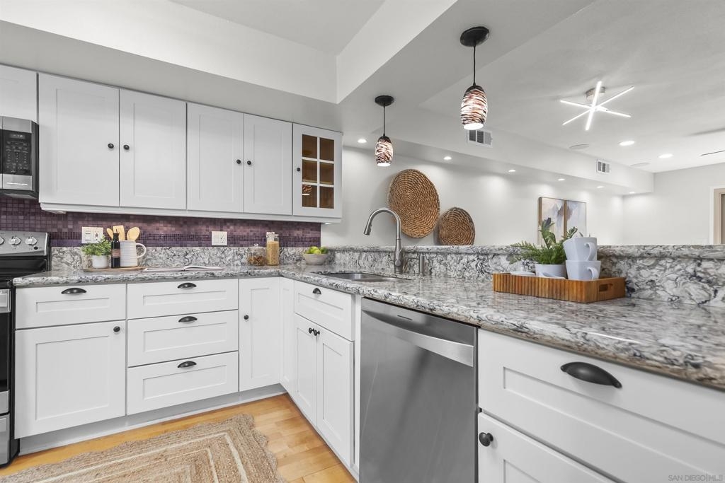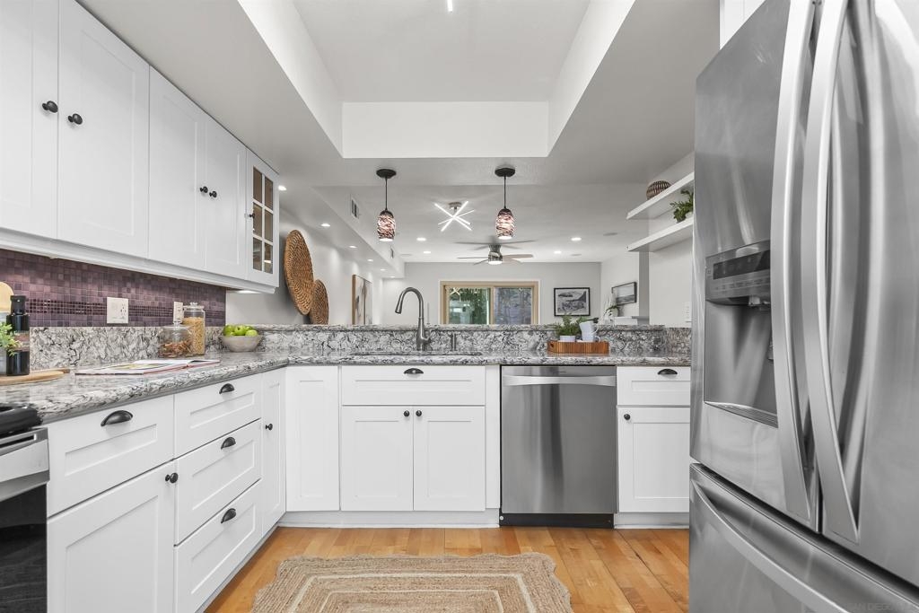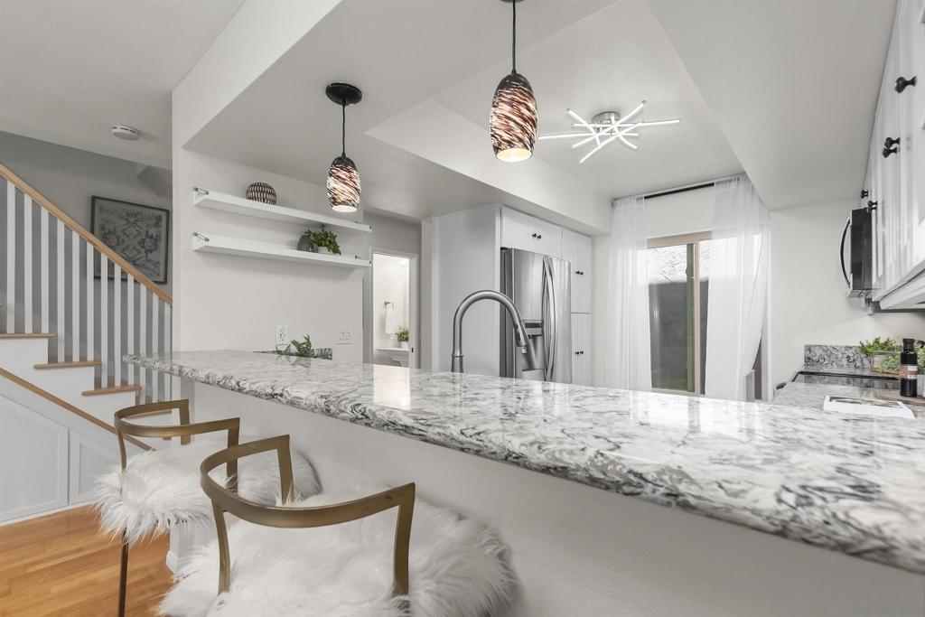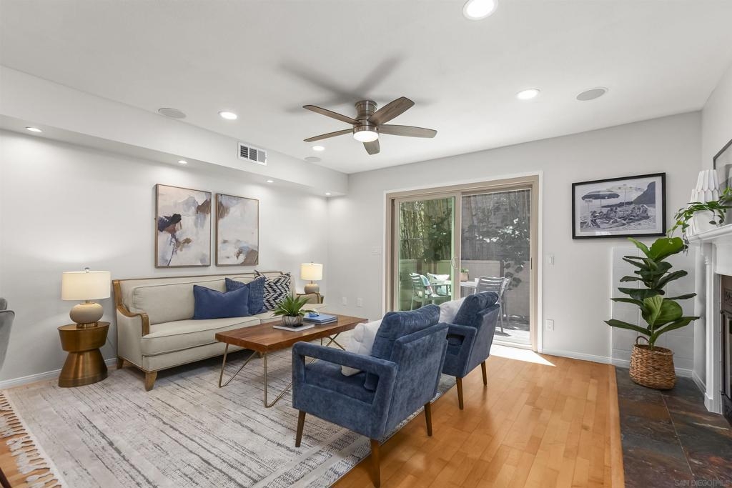 Completely remodeled and move-in ready, this Point Loma residence blends modern upgrades with timeless coastal convenience. The kitchen showcases granite counters and a bar that opens to the dining and family rooms. All three bathrooms were recently redone—both upstairs ensuite baths taken down to the studs, one with a jetted tub/shower combo and the other with a full-size shower, plus a first-floor powder room with custom tilework and pedestal sink. A new custom hardwood staircase and railing provide enhanced safety and striking design. Other highlights include hardwood flooring on the main level, gas fireplace, built-in ceiling speakers in the family room, recessed lighting, upstairs laundry, and a unique custom under-stair storage system. System upgrades include a new energy-efficient HVAC with smart thermostat and all-new dual-pane windows and sliding glass door. The private fenced patio is ideal for outdoor dining or gardening. Gated garage parking includes an oversized private storage room. With no neighbors above or below, this turnkey home offers the feel of a detached residence just minutes from beaches, Liberty Station, Downtown, and the airport. The kitchen was thoughtfully upgraded with custom cabinetry featuring pull-out drawers for maximum function and storage. Both ensuite bathrooms were rebuilt down to the studs with custom tile, glass enclosures, and new ventilation—one with a jetted tub/shower combo and the other with a full-size shower—while the powder room was redone with new tile, a pedestal sink, and ventilation. A brand-new custom hardwood staircase and handrail replaced the original, providing both safety and design impact. Additional enhancements include new recessed lighting, newer carpet upstairs, fresh interior paint, and a custom-built under-stair storage system designed specifically for this home with three pull-out sections. Outdoor improvements feature a private fenced patio with pavers, added outlets, and new exterior lighting. Systems were upgraded with a brand-new energy-efficient heat pump/HVAC with smart thermostat and all-new dual-pane windows and sliding glass door.