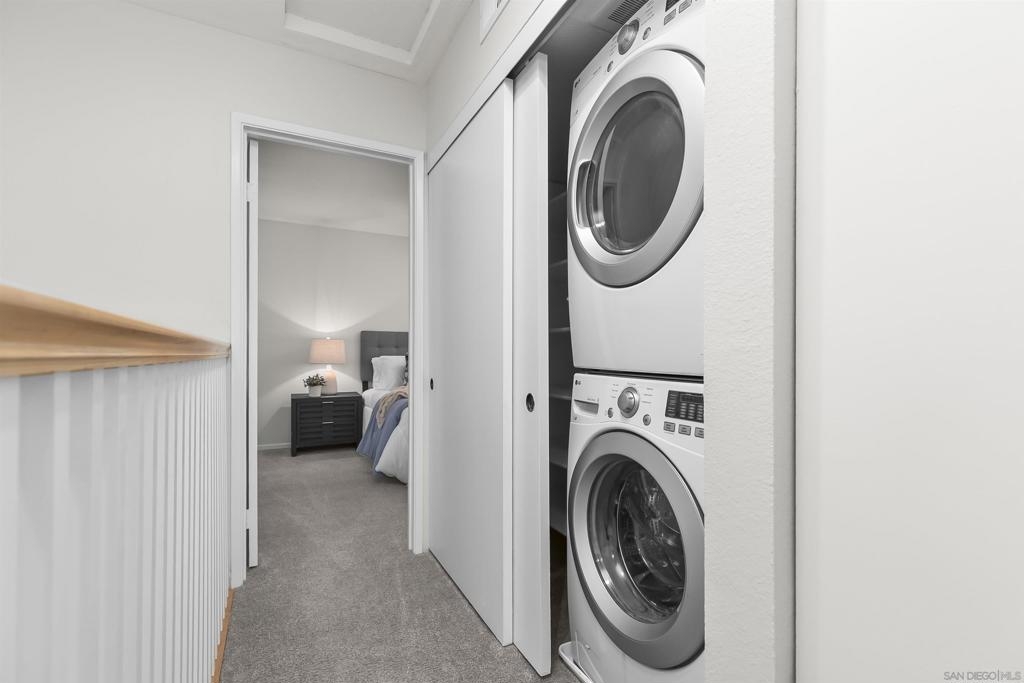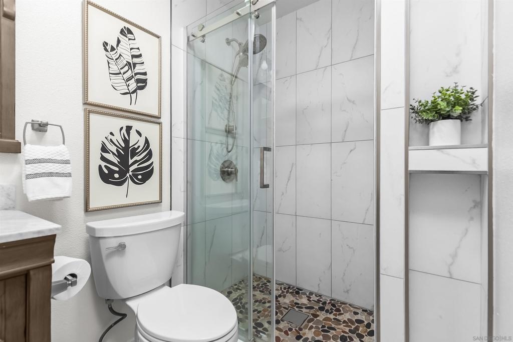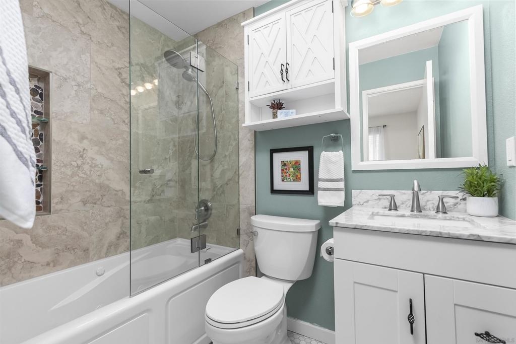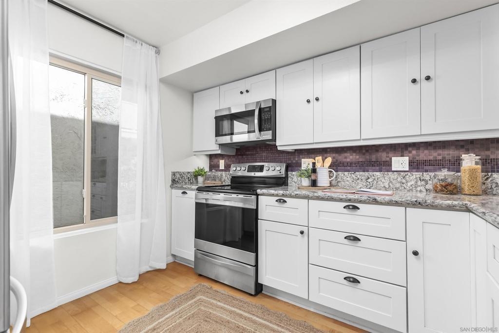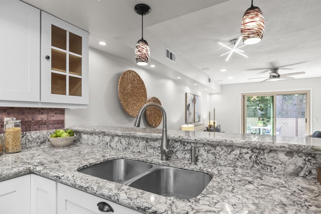 Completely remodeled and move-in ready, this Point Loma residence blends modern upgrades with timeless coastal convenience. The kitchen showcases granite counters and a bar that opens to the dining and family rooms. All three bathrooms were recently redone—both upstairs ensuite baths taken down to the studs, one with a jetted tub/shower combo and the other with a full-size shower, plus a first-floor powder room with custom tilework and pedestal sink. A new custom hardwood staircase and railing provide enhanced safety and striking design. Other highlights include hardwood flooring on the main level, gas fireplace, built-in ceiling speakers in the family room, recessed lighting, upstairs laundry, and a unique custom under-stair storage system. System upgrades include a new energy-efficient HVAC with smart thermostat and all-new dual-pane windows and sliding glass door. The private fenced patio is ideal for outdoor dining or gardening. Gated garage parking includes an oversized private storage room. With no neighbors above or below, this turnkey home offers the feel of a detached residence just minutes from beaches, Liberty Station, Downtown, and the airport. The kitchen was thoughtfully upgraded with custom cabinetry featuring pull-out drawers for maximum function and storage. Both ensuite bathrooms were rebuilt down to the studs with custom tile, glass enclosures, and new ventilation—one with a jetted tub/shower combo and the other with a full-size shower—while the powder room was redone with new tile, a pedestal sink, and ventilation. A brand-new custom hardwood staircase and handrail replaced the original, providing both safety and design impact. Additional enhancements include new recessed lighting, newer carpet upstairs, fresh interior paint, and a custom-built under-stair storage system designed specifically for this home with three pull-out sections. Outdoor improvements feature a private fenced patio with pavers, added outlets, and new exterior lighting. Systems were upgraded with a brand-new energy-efficient heat pump/HVAC with smart thermostat and all-new dual-pane windows and sliding glass door.