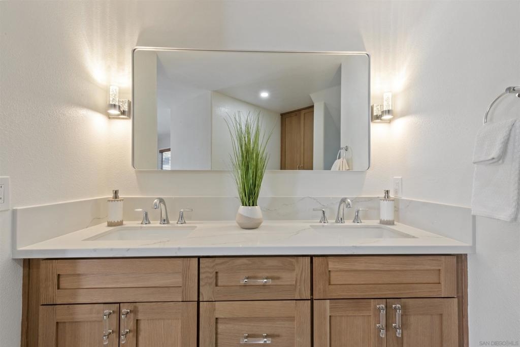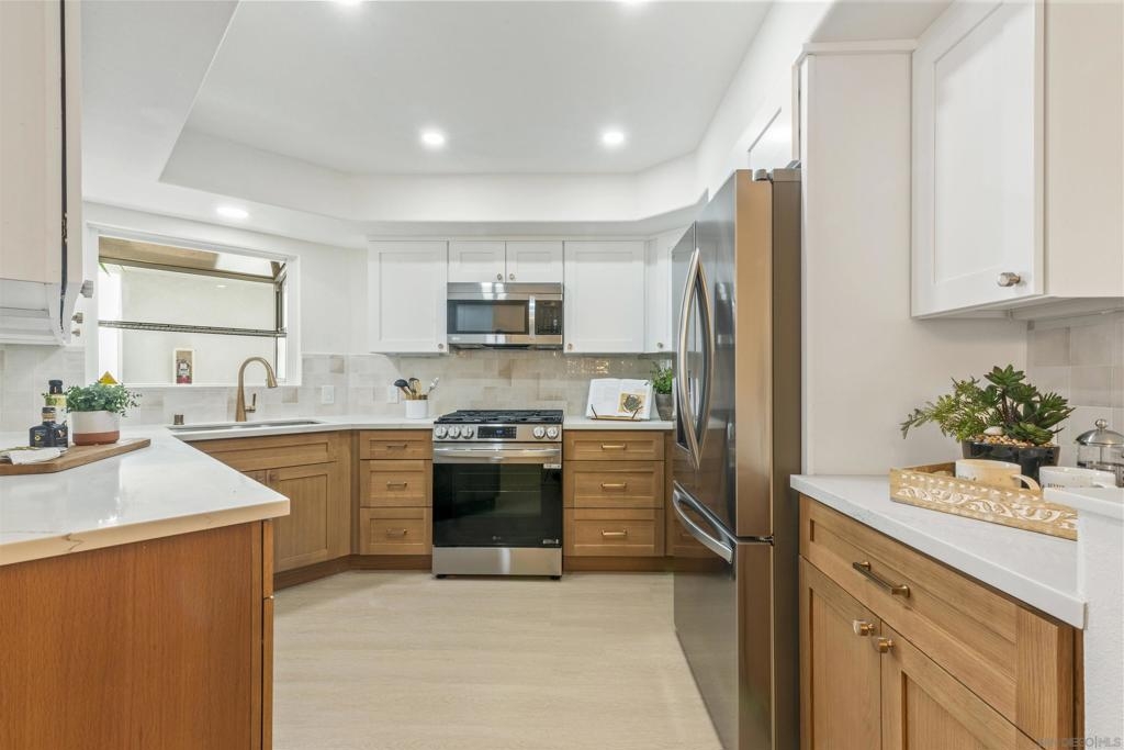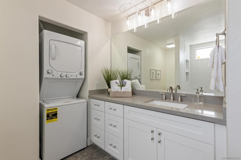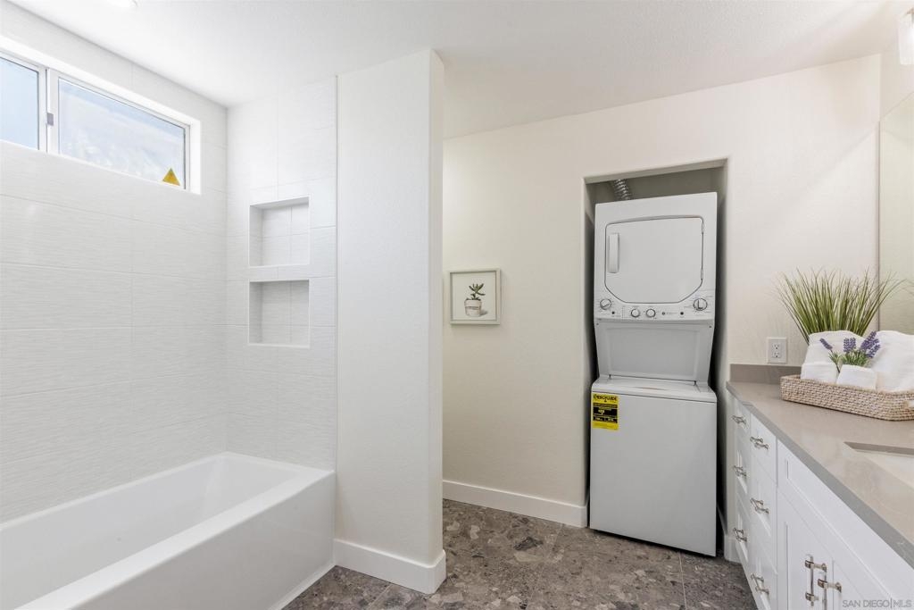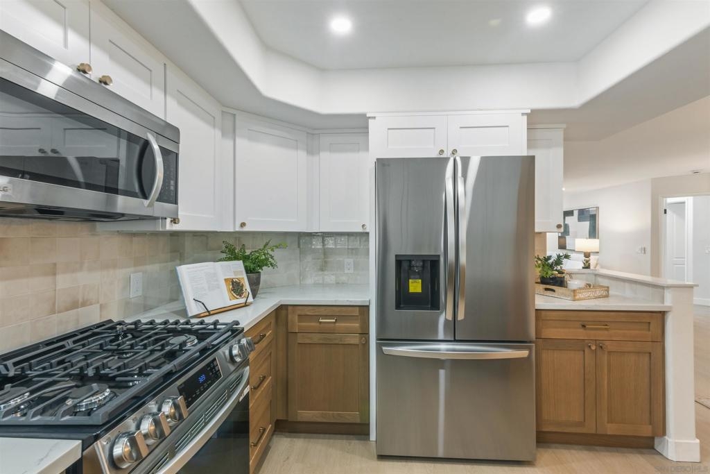 Live the coastal lifestyle in this beautifully renovated two-story condo located in the highly sought after Vista La Playa complex, just steps from Kellogg’s Beach in San Diego’s prestigious Point Loma neighborhood. Featuring luxury vinyl flooring throughout, brand new LG appliances, modern lighting, and fresh interior paint, this turnkey home is designed for comfort and style. The kitchen and bathrooms have been fully upgraded with quartz countertops, shaker cabinets, new plumbing fixtures, and contemporary tile work, making every space feel brand new. The flexible layout offers a private master retreat on the entry level, complete with its own entrance, bathroom, and patio. It's ideal for hosting guests or maintaining personal privacy while living upstairs. Enjoy the convenience of in-unit laundry, a new washer and dryer combo, a new furnace, and two parking spots in a secure gated garage. Relax or entertain on the rooftop deck offering panoramic views of the San Diego Bay, downtown skyline, Coronado, and Point Loma. This rare amenity truly sets the condo apart. This is beachside living at its best, just moments from the sand, scenic walking paths, yacht clubs, local eateries, and all that Point Loma Village has to offer.