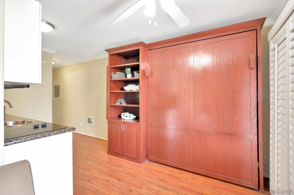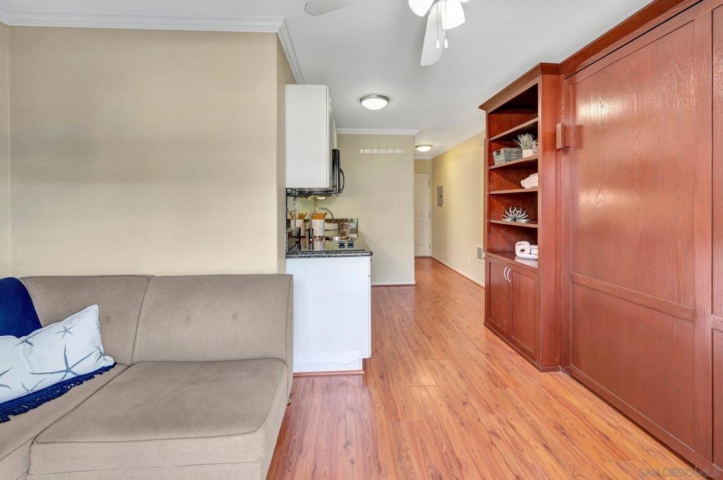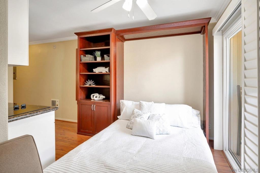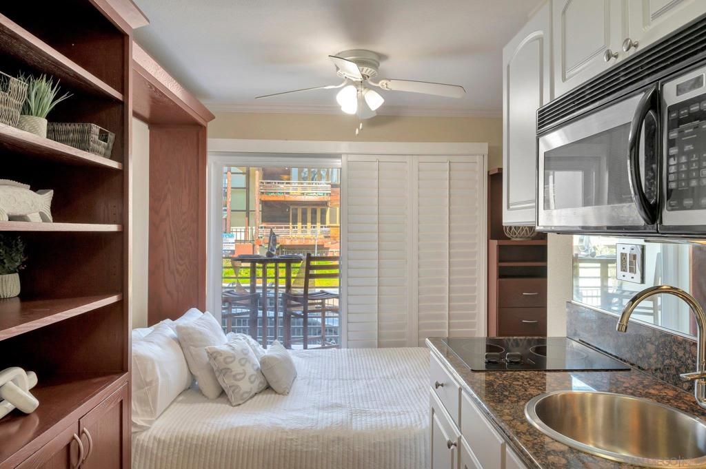 An extraordinary opportunity to live by the Bay in Point Loma! Talk about a dream location!!! This fantastic studio is right next to the world famous San Diego Yacht Club! This is truly a minimalist's dream come true! The studio offers a custom, solid wood Murphy Bed with fold-down table, and custom couch made to fit the space and a nice walk in closet. The unit also comes with its own covered parking space. The secure, gated condominium complex offers not only a pool with a view area of the bay but a communal quiet library-office space to read and enjoy, a workout and billiards room. This is Outdoor life at its best. The complex has pet policy of 2 pets not over 60 pounds also kayak & bike storage as well! You will feel like you are on a vacation every day! Morning Walks to Shelter Island lunch at the Brigatine, Liberty station for dinner options galore! Saturdays are a great day to walk to Point Loma Seafood for lunch and then grab a quick beer at Eppig Brewery or perhaps happy hour is your thing Bali Hai is the perfect sunset location. Sunday strolls on Kelloggs beach and a fun day fishing at the pier. All of these amazing places are within walking distance to your new home!