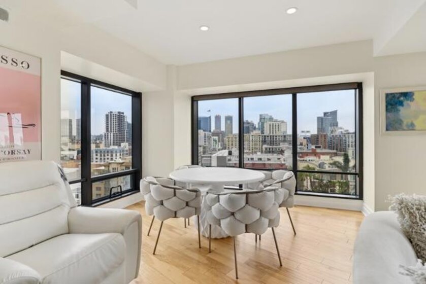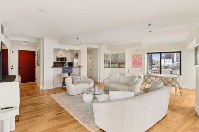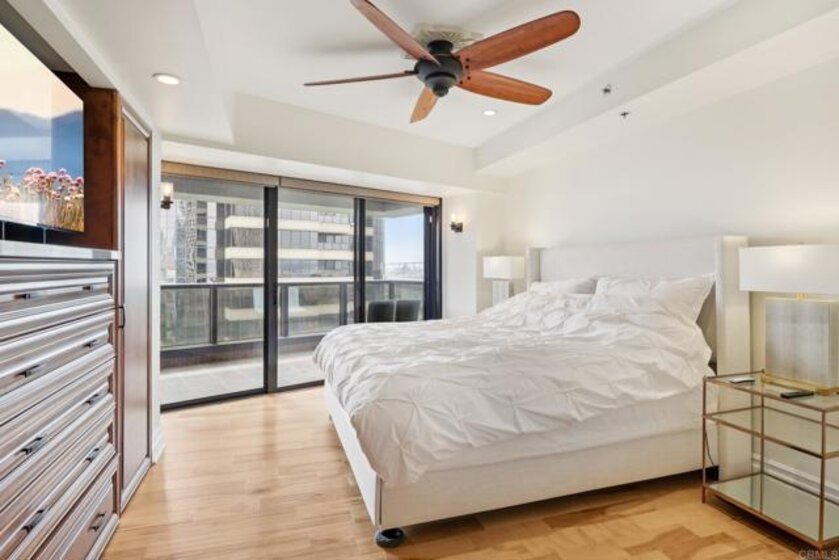 Remodeled 11th Floor Harbor Club Residence with Stunning Bay & City Views Beautifully upgraded residence in the prestigious Harbor Club, located on the 11th floor with spectacular views of San Diego Bay, Coronado Bridge, and the city skyline. This light-filled 1BR/1BA unit features hardwood flooring throughout, recessed lighting, and floor-to-ceiling windows with motorized roller shades. The modern kitchen has been fully remodeled with GE stainless steel appliances, Amazonite countertops, and a breakfast bar. The updated bathroom includes a frameless glass shower with marble wall surround and dual vessel sinks. The spacious primary bedroom offers custom built-in cabinetry, an entertainment center, and direct access to the southeast-facing private balcony. In-unit stackable washer/dryer included. Harbor Club offers luxury amenities including 24-hour front desk/security, a fully equipped fitness center, a beautifully landscaped pool deck with 95-foot lap pool and spa, club room, business center, and more. Prime Marina District location with walkability to Petco Park, Gaslamp Quarter, Embarcadero, dining, shopping, and public transportation.
