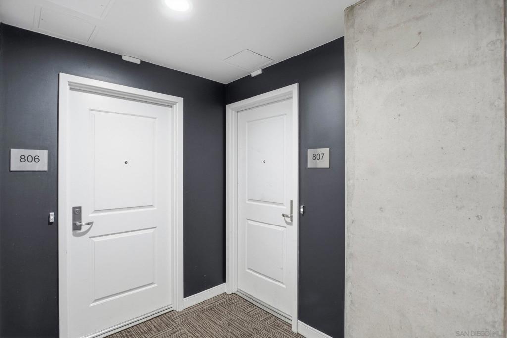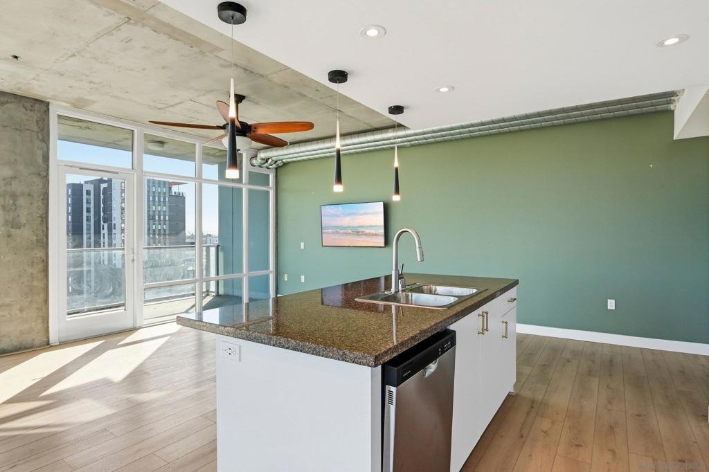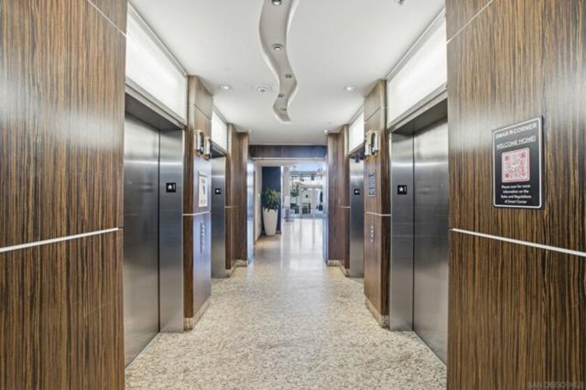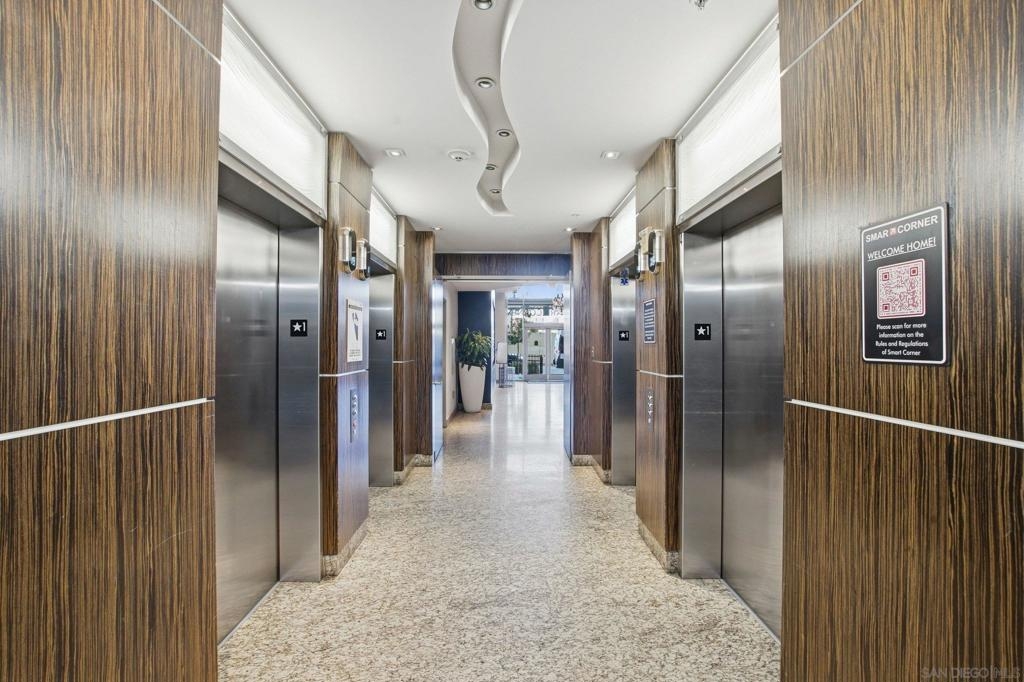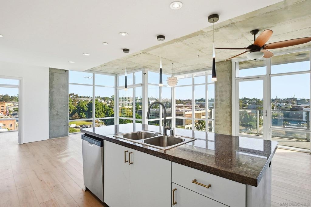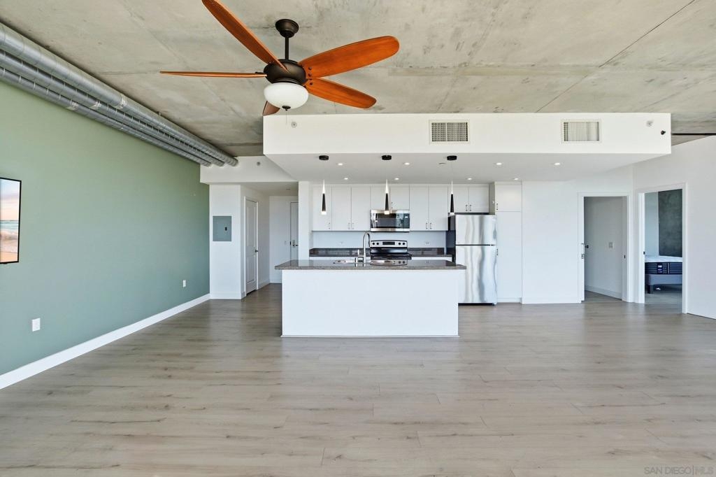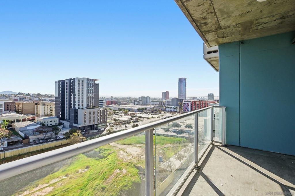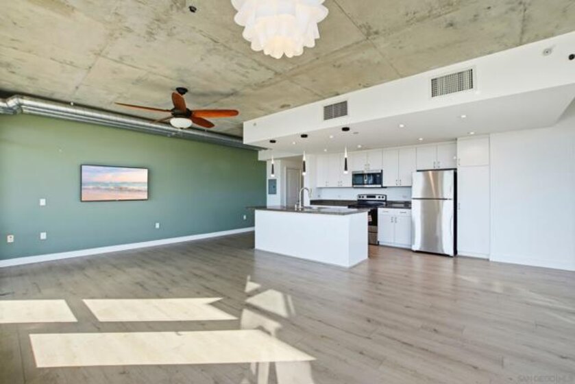 Value Range $600,000-$615,000. Set above the city on the 8th floor, this corner residence at Smart Corner delivers modern downtown living with exceptional light, style, and convenience. With south/east- and north-facing exposures, the residence features floor-to-ceiling windows throughout, a south/east-facing balcony, and abundant natural light filling both the living spaces and bedroom. The home showcases a modern industrial aesthetic with concrete ceilings and exposed ductwork, paired with a thoughtfully designed open-concept layout ideal for entertaining or a live/work lifestyle. Recent upgrades include new luxury vinyl flooring, fresh interior paint, and all brand-new kitchen appliances, with a convenient in-unit stackable washer and dryer located in the hallway laundry closet. This one-bedroom (with optional 2 bedroom) residence offers the rare advantage of two full bathrooms, along with ceiling fans in the primary bedroom and open living/dining area, central heating and air, and two tandem parking spaces in a gated underground garage with elevator access to the residential floors. The pet-friendly community offers a rooftop spa, barbecue area, outdoor common spaces, and a second-floor fitness center, and is ideally situated near public transportation, major freeways, San Diego City College, everyday conveniences such as Starbucks, Subway, and 7-Eleven just outside the building, and close proximity to San Diego Bay, Balboa Park, the world-famous San Diego Zoo, the Gaslamp Quarter, Petco Park, dining, shopping, and nightlife. Underground parking is P4-155 and P4-156
