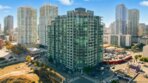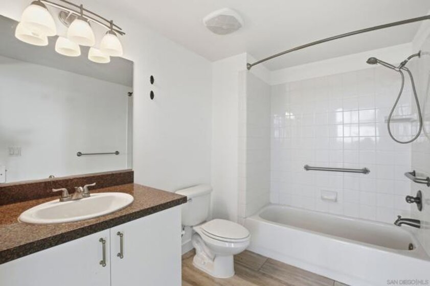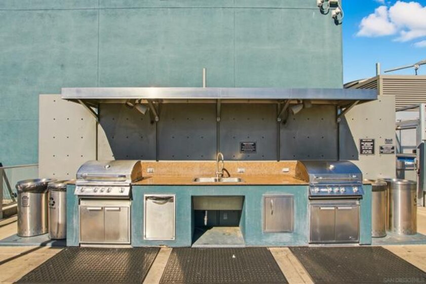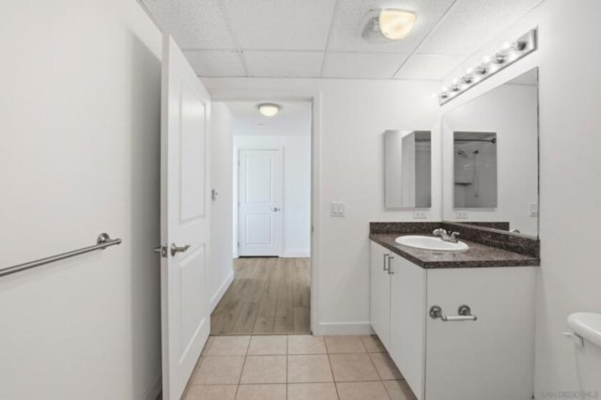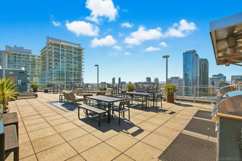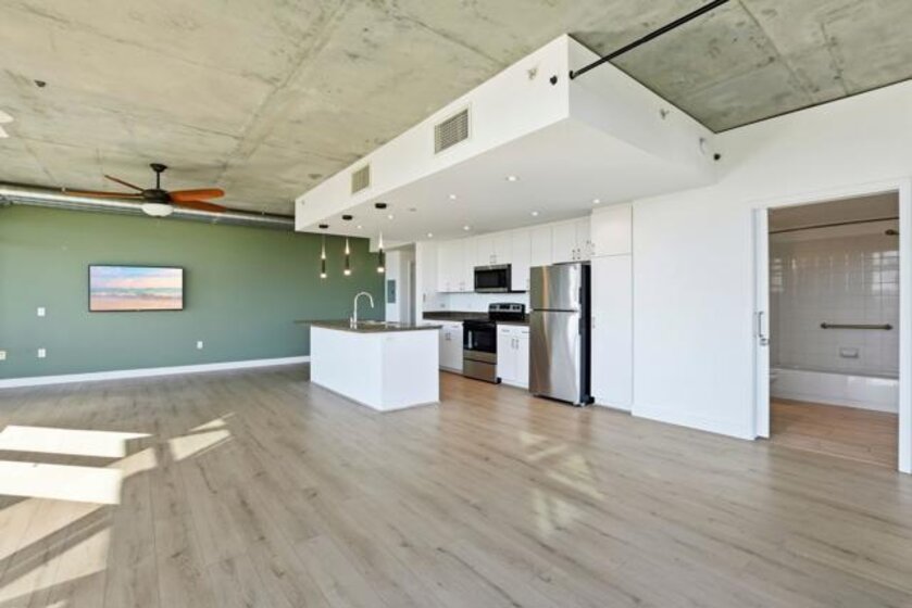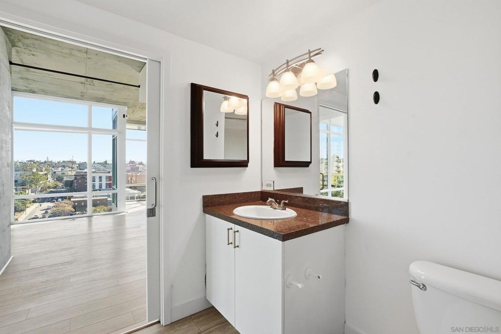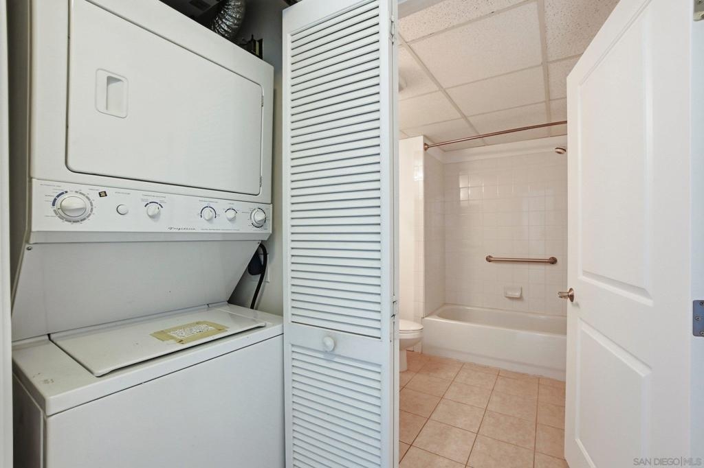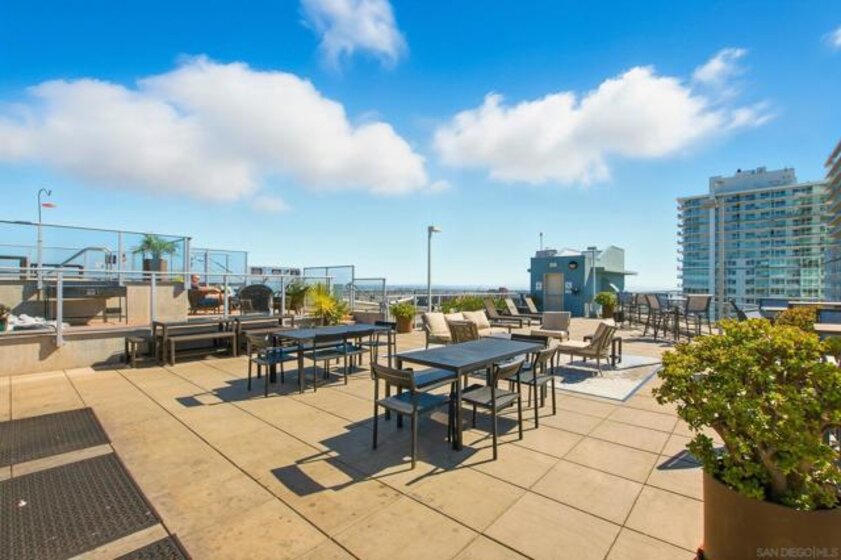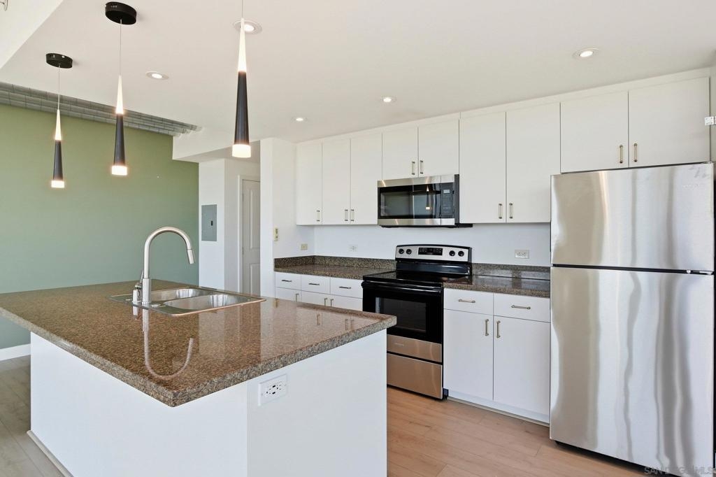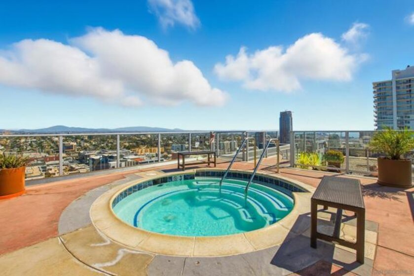 Value Range $600,000-$615,000. Set above the city on the 8th floor, this corner residence at Smart Corner delivers modern downtown living with exceptional light, style, and convenience. With south/east- and north-facing exposures, the residence features floor-to-ceiling windows throughout, a south/east-facing balcony, and abundant natural light filling both the living spaces and bedroom. The home showcases a modern industrial aesthetic with concrete ceilings and exposed ductwork, paired with a thoughtfully designed open-concept layout ideal for entertaining or a live/work lifestyle. Recent upgrades include new luxury vinyl flooring, fresh interior paint, and all brand-new kitchen appliances, with a convenient in-unit stackable washer and dryer located in the hallway laundry closet. This one-bedroom (with optional 2 bedroom) residence offers the rare advantage of two full bathrooms, along with ceiling fans in the primary bedroom and open living/dining area, central heating and air, and two tandem parking spaces in a gated underground garage with elevator access to the residential floors. The pet-friendly community offers a rooftop spa, barbecue area, outdoor common spaces, and a second-floor fitness center, and is ideally situated near public transportation, major freeways, San Diego City College, everyday conveniences such as Starbucks, Subway, and 7-Eleven just outside the building, and close proximity to San Diego Bay, Balboa Park, the world-famous San Diego Zoo, the Gaslamp Quarter, Petco Park, dining, shopping, and nightlife. Underground parking is P4-155 and P4-156