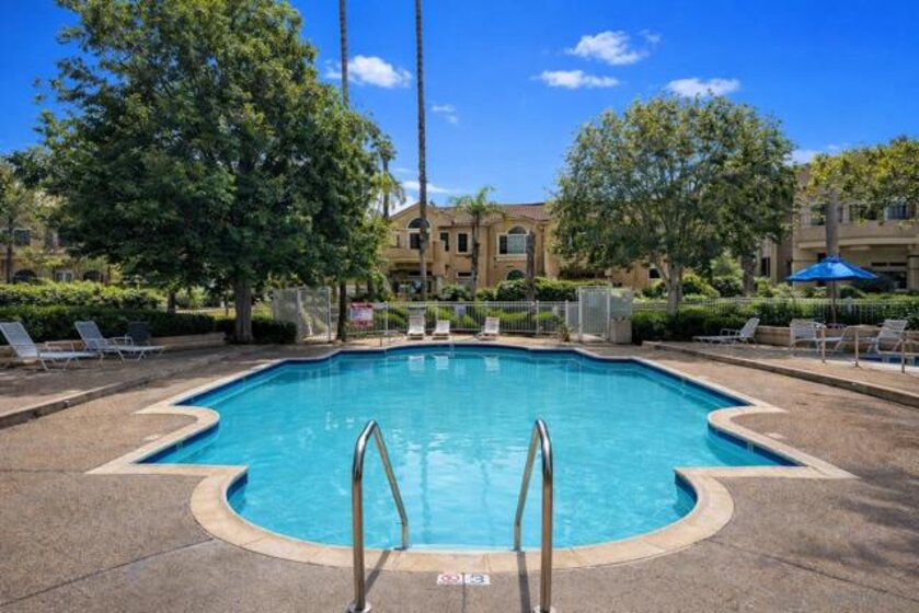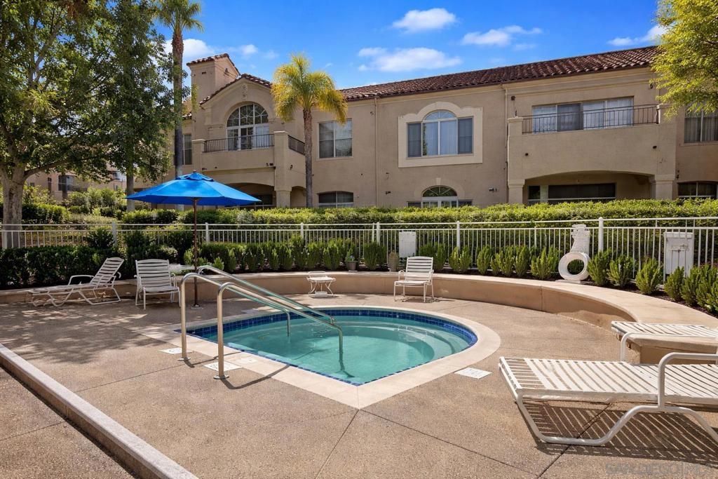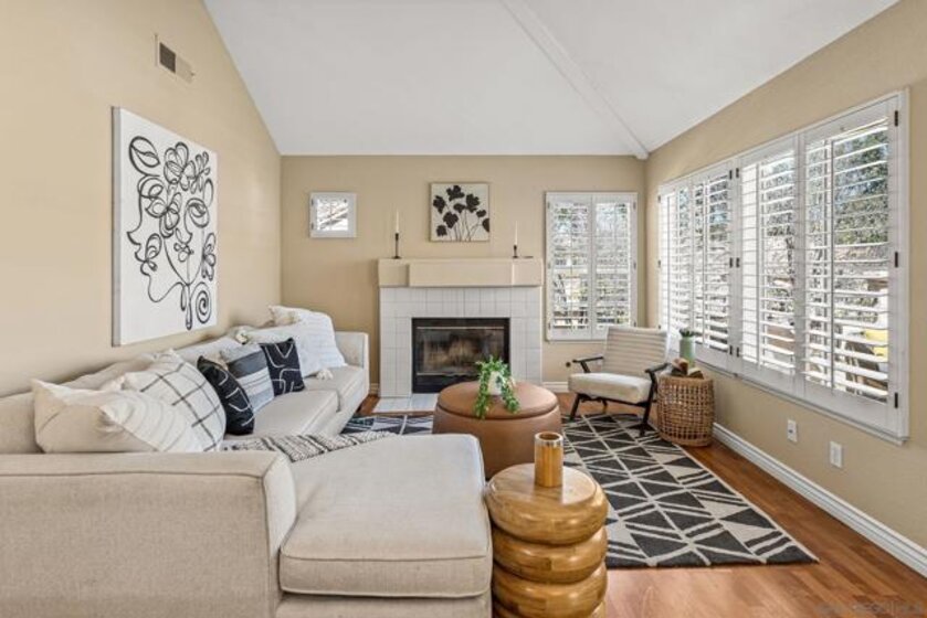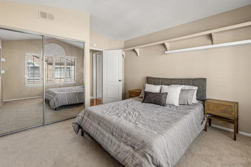 Tucked away at the end of a quiet cul-de-sac in the highly desirable Belsera community, this private 2-bedroom, 2-bath end unit offers the perfect blend of comfort, light, and lifestyle. With soaring ceilings and an open-concept design, the home feels bright and spacious from the moment you walk in, while its west-facing orientation helps keep the interior cooler during warmer months. The kitchen was updated in 2025 with refreshed quartz countertops, painted cabinetry, new sink and faucet, & upgraded lighting, opening seamlessly to the main living space ideal for both everyday living & entertaining. Additional improvements include fresh interior paint, brand new carpet, & a water heater and pressure regulator replaced in 2023. The bathroom was also upgraded in 2023 with new countertops, fixtures, glass shower doors, & a refinished tub, creating a clean & modern feel. Large windows bring in abundant natural light, while the elevated private balcony positioned above neighboring units offers a peaceful space to relax or host, overlooking greenspace and a seasonal creek during rainfall. Additional features include air conditioning, an attached one-car garage, a second assigned parking space, & in-unit washer and dryer. The home also benefits from a quiet setting, great neighbors, & a level of privacy that is hard to find. Residents of Belsera enjoy resort-style amenities including two swimming pools, picnic and BBQ areas, volleyball courts, scenic walking paths, and direct access to Mission Trails Regional Park—bringing an active, outdoor lifestyle right to your doorstep.