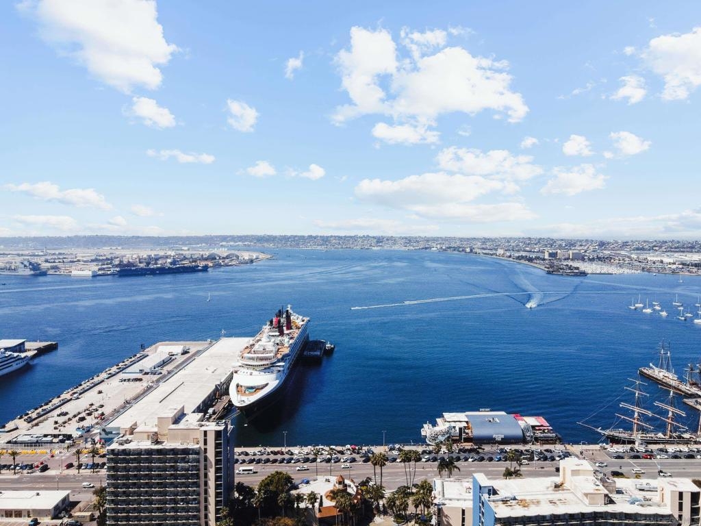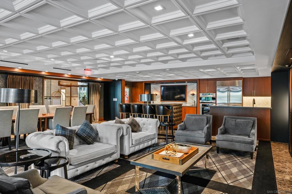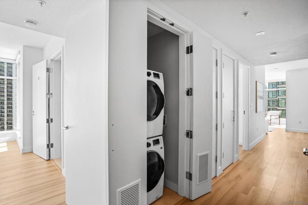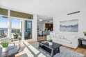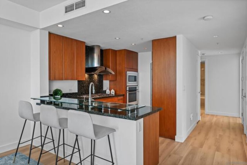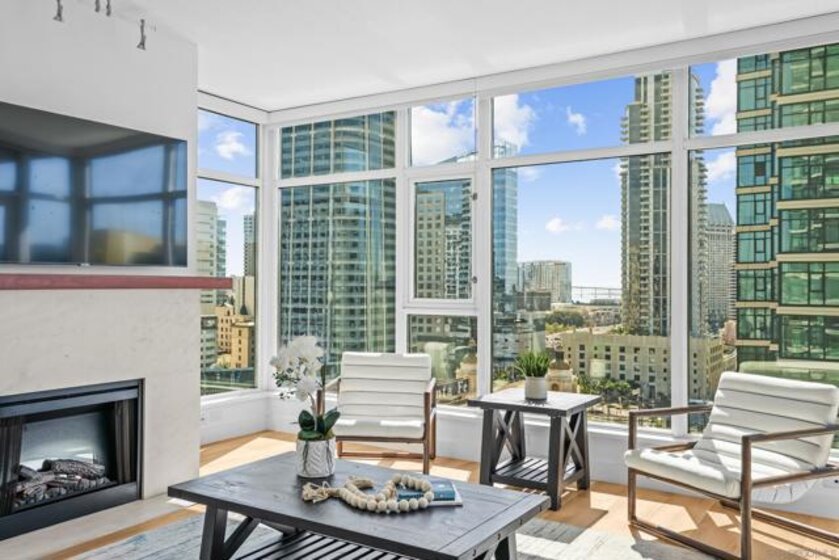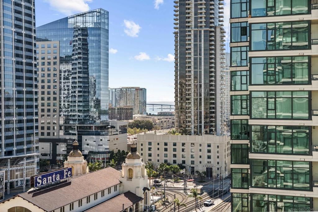 Experience turnkey coastal living in Residence 1505 at The Grande North at Santa Fe Place, a stunning corner residence showcasing views of San Diego Bay, the Coronado Bridge, and the glittering downtown skyline. Expansive walls of windows fill the home with natural light while framing ever-changing waterfront vistas. This beautifully appointed two-bedroom, two-bath residence features rich hardwood floors, an open and inviting living space, and a private terrace perfect for enjoying passing sailboats and the energy of the city below. The chef’s kitchen is thoughtfully designed with GE stainless steel appliances, granite countertops, and generous cabinetry for ample storage. Additional highlights include a full-size washer and dryer, custom window shades, surround sound, and two secured parking spaces. Located in the highly desirable Columbia District, The Grande places residents moments from the Embarcadero waterfront, Little Italy’s renowned dining scene, Seaport Village, and the Gaslamp Quarter. Residents enjoy an exceptional collection of resort-style amenities, including 24-hour concierge and security, a state-of-the-art fitness center, a recently renovated 80-foot lap pool, spa, steam and sauna rooms, bicycle storage, and a fully appointed guest suite with dedicated parking. The elegant Club Room offers a full kitchen, bar, and entertainment lounge.