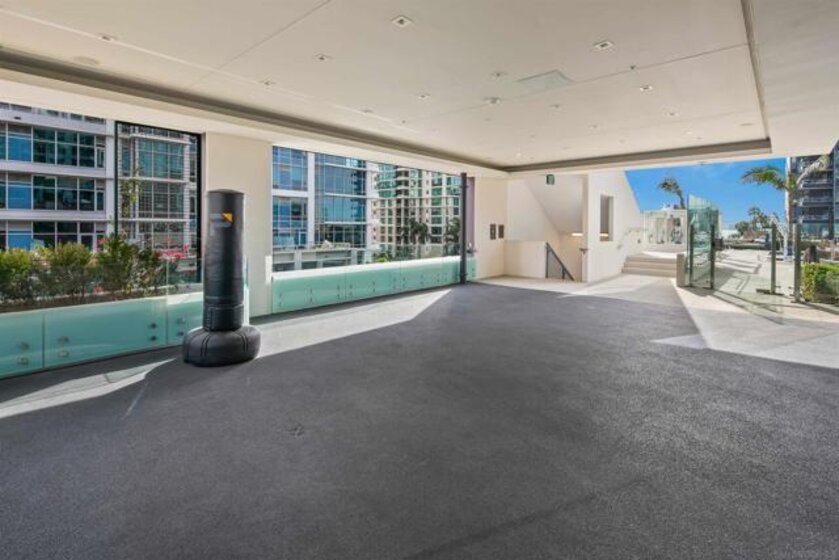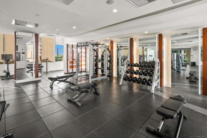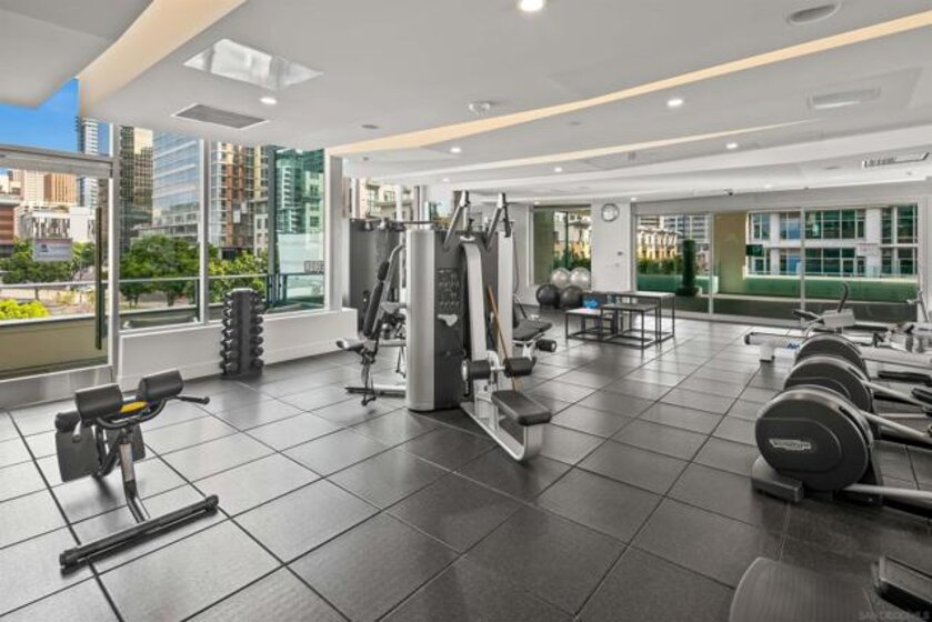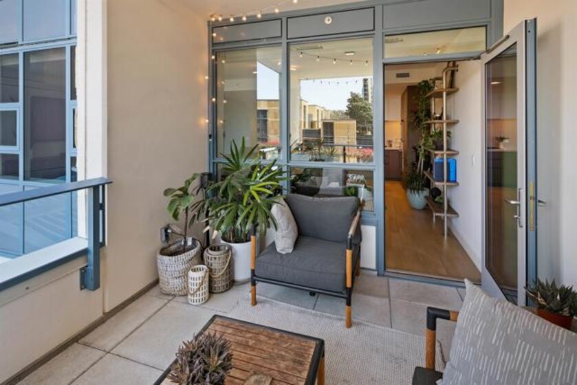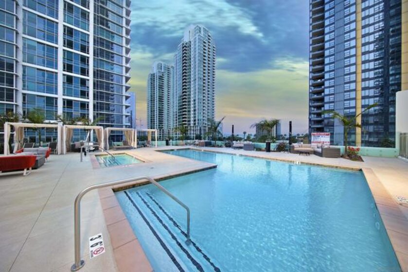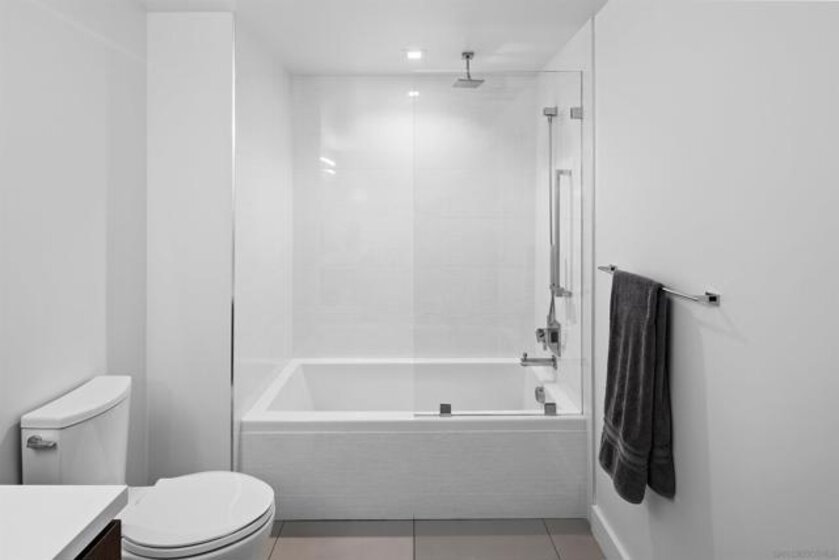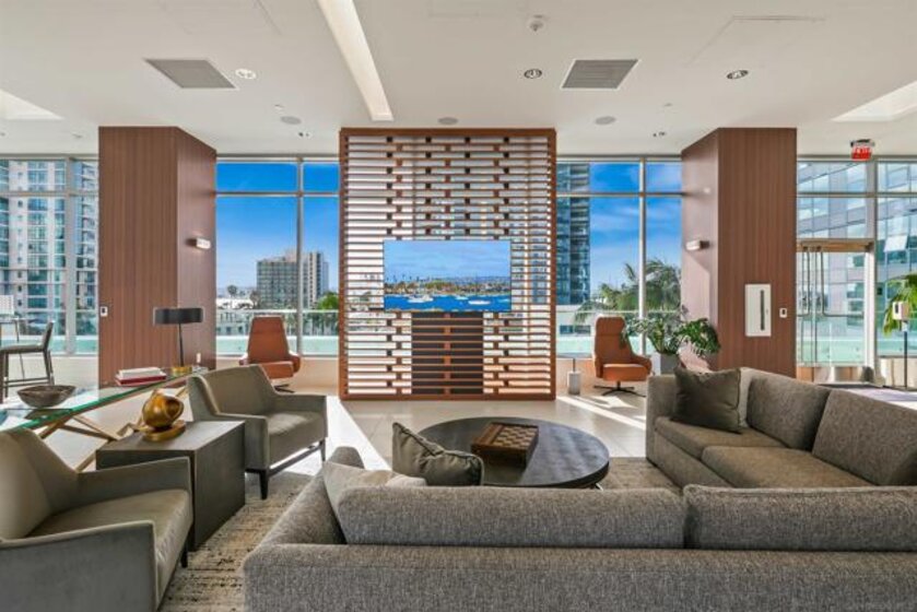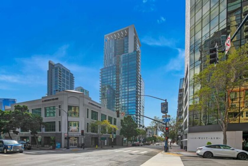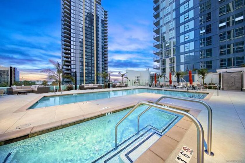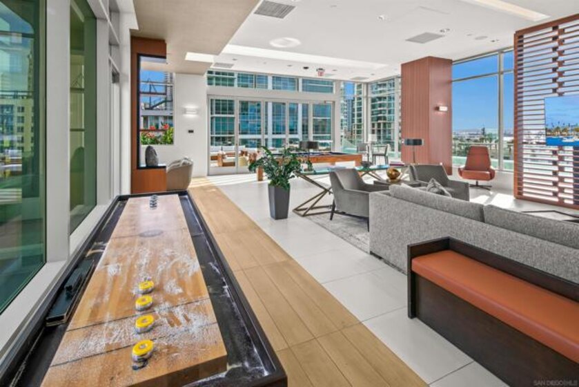 Rarely available and impressively spacious, this oversized one-bedroom residence offers a standout floor plan with a true primary retreat and a convenient hallway half bath for guests—perfect for both everyday comfort and entertaining. Designed for modern living, the open-concept layout seamlessly connects the kitchen, dining, and living spaces. The chef-inspired kitchen features premium Thermador stainless steel appliances, sleek polished quartz countertops, and a stunning waterfall-edge island that anchors the space with style. Enjoy a bright west-facing orientation that fills the home with natural light and extends out to a generous 120 SF private covered balcony—your own outdoor lounge and effortless indoor-outdoor living. The expansive primary retreat feels like a private sanctuary, complete with a spa-inspired en-suite bath featuring a contemporary stone vanity, Kohler sink, and Grohe fixtures. Savina elevates everyday living with over 24,000 sq ft of resort-style amenities, including a state-of-the-art fitness center, pool and spa, sauna and steam rooms, outdoor BBQ and dining areas, pet relief area, and a beautifully designed social lounge with full kitchen, billiards, and complimentary WiFi. Residents also enjoy 24-hour attendant service and secure access. Ideally located in the vibrant Columbia District, just steps from Little Italy, this home offers unbeatable walkability to top restaurants, coffee shops, Waterfront Park, the Embarcadero, Rady Shell, and Petco Park. With easy access to trolley and train stations and just minutes to the airport.