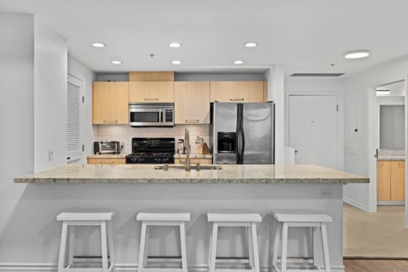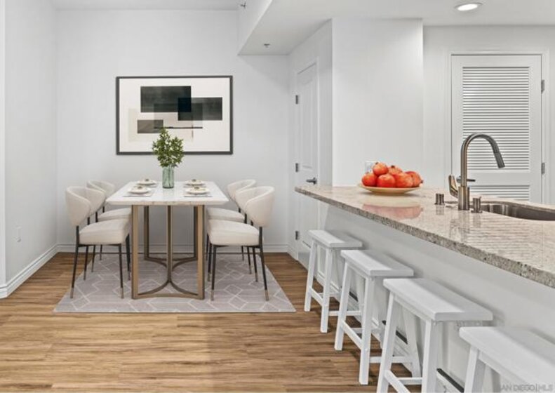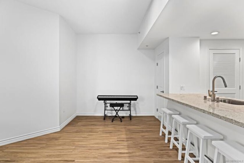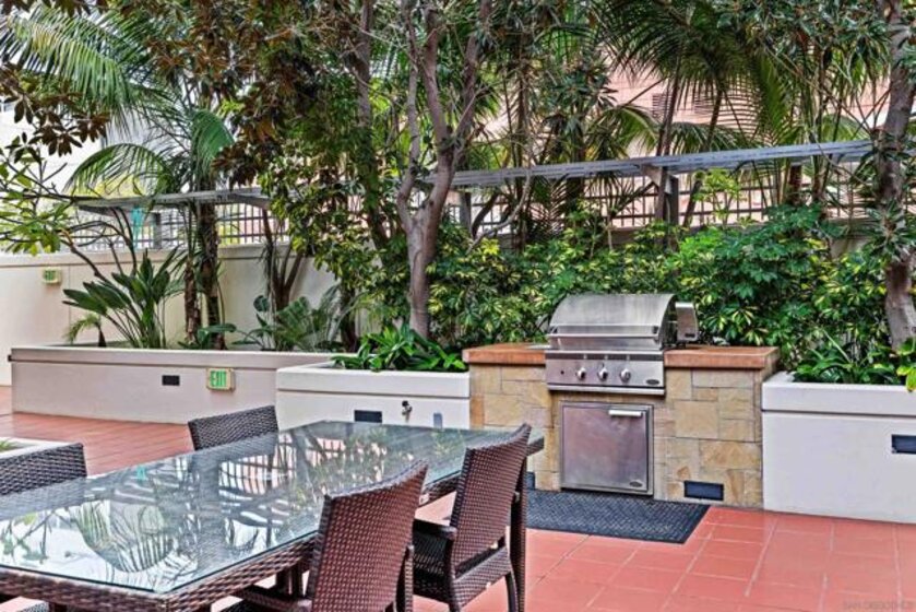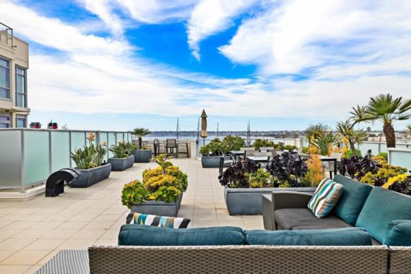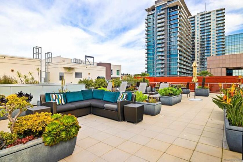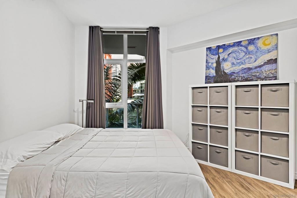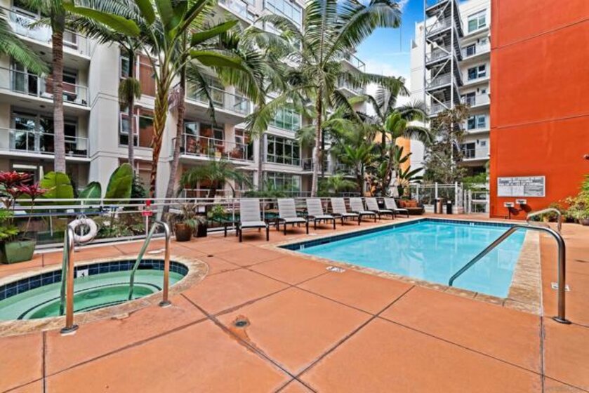 Welcome to Breeza, one of the most desirable residences in the Downtown's Little Italy neighborhood. This is one of only six oversized one-bedroom homes in the entire community—making it a truly rare opportunity and arguably one of the finest one-bedroom residences in the neighborhood. This beautifully maintained home showcases pride of ownership throughout and features a bright open-concept floor plan designed for comfortable living and effortless entertaining. The chef-inspired kitchen is centered around a large granite island with breakfast bar, complemented by stainless steel appliances, abundant cabinetry, and generous counter space. Soaring 10-foot ceilings in both the living room and bedroom enhance the sense of space, while beautiful wood flooring and large windows create a light and inviting atmosphere. The spacious bedroom offers direct access to the well-appointed bathroom with dual vanities, creating a convenient and functional layout. Step outside to your private oversized balcony, perfectly positioned among mature whispering palms overlooking Breeza’s award-winning courtyard—providing a peaceful and private retreat rarely found in urban living. Additional highlights include P-1 parking, new plumbing hardware, new washer and dryer, and updated lighting. Ideally located at the southwest edge of Little Italy and just one block from the waterfront, this home offers one of downtown San Diego’s most walkable lifestyles, moments from the scenic San Diego Bay and the beautiful Waterfront Park. Residents of Breeza enjoy a welcoming community atmosphere and resort-style amenities, including a heated pool and spa, fully equipped fitness center, community lounge, business center, Wi-Fi in common areas, on-site professional management, and a spectacular 8th-floor rooftop terrace with unobstructed views of the bay, sunsets, the historic Star of India, and the downtown skyline. Just steps from Little Italy’s celebrated restaurants, cafés, and the renowned weekly farmers market, and moments from Waterfront Park featuring playgrounds, open green space, pickleball and basketball courts, and a dog park. A rare and exceptional opportunity in one of downtown San Diego’s most sought-after communities—priced to sell.