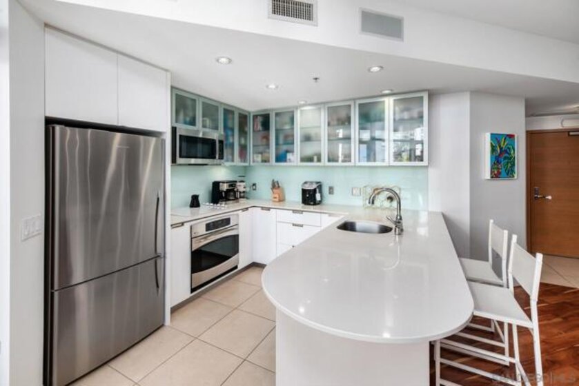 Live in the coveted Aria building perched on Cortez Hill. This contemporary turn key condo has an open floor plan with high ceilings, ample natural light, outfitted for surround sound throughout with Acacia wood flooring. Enjoy your morning coffee or an evening glass of wine on your spacious balcony. Kitchen is complete with quartz island/countertops, glass back splash, newly re-finished cabinets with a 10 year warranty and stainless steel energy efficient appliances. Full size stacked washer/dryer convey. 2 car (tandem) underground secure parking spaces #56. This modern complex features, a gym, rec room/club house, heated pool and spa. Excellent walk score, steps to Balboa Park, Tweat Street Park, Little Italy, Gaslamp District, Hillcrest and short drive to the airport.