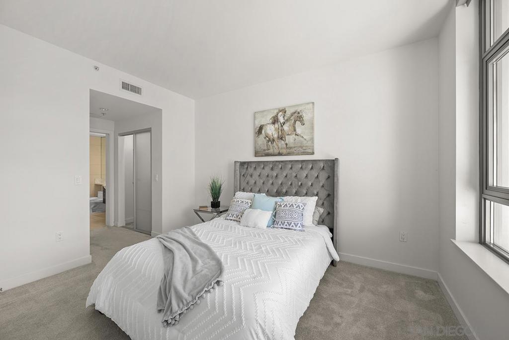 Capture the best of Downtown San Diego living in this 6th-floor, west-facing Aria residence. Enjoy city views and sunset skies from your private balcony. Inside, this spacious one-bedroom features modern "Woodacres Oak" luxury vinyl flooring, abundant natural light, and an open layout ideal for both relaxation and entertaining. The kitchen impresses with stainless appliances, recessed lighting, quartz counters and a stylish eat-at bar with a waterfall edge that is perfect for casual dining. The bedroom offers comfort and privacy with an ensuite bathroom and generous closet space. Added conveniences include in-unit stackable washer/dryer and a secured parking space. Perched in the highly sought-after Cortez Hill neighborhood, residents enjoy a serene, residential atmosphere just minutes from Downtown San Diego’s premier dining, shopping, cultural attractions, and the vibrant Gaslamp Quarter. Discover modern luxury living in one of Downtown’s most charming and well-connected communities. Located atop Cortez Hill, the highest point in San Diego, Aria was completed in 2008 and comprises 137 units. This prime location is set away from the city's hustle and bustle, offering both tranquility and convenience. Residents can enjoy a short stroll or drive to Balboa Park and the vibrant offerings of Downtown San Diego, coupled with excellent freeway access for broader travels. Aria residences boast spacious outdoor balconies and terraces, enhancing the living experience with modern comforts and stunning views of the bay, Balboa Park, and the city skyline. The building's amenities include a fitness center, lap pool and spa, club room with a catering kitchen and wet bar, all designed to elevate the quality of life for its residents.