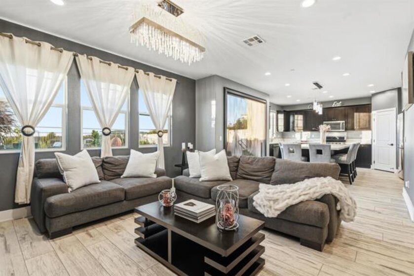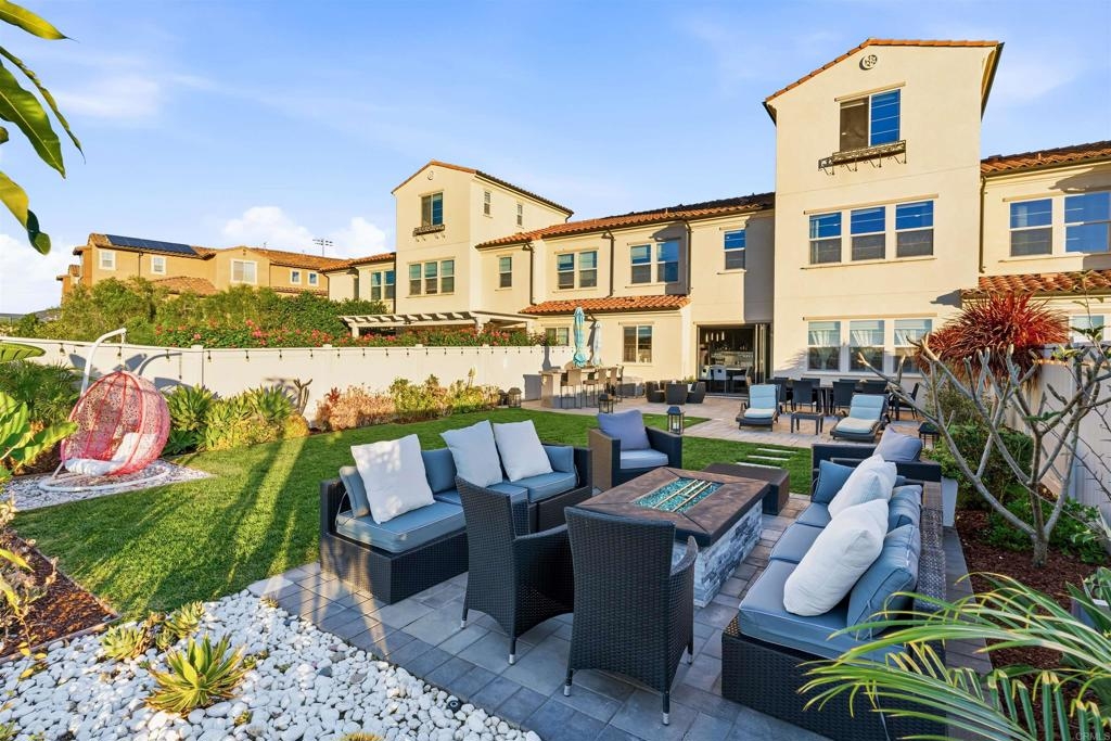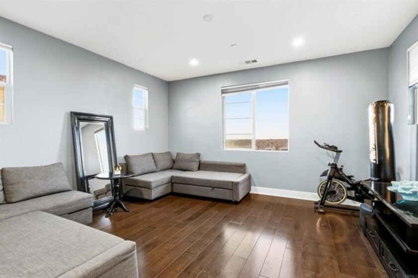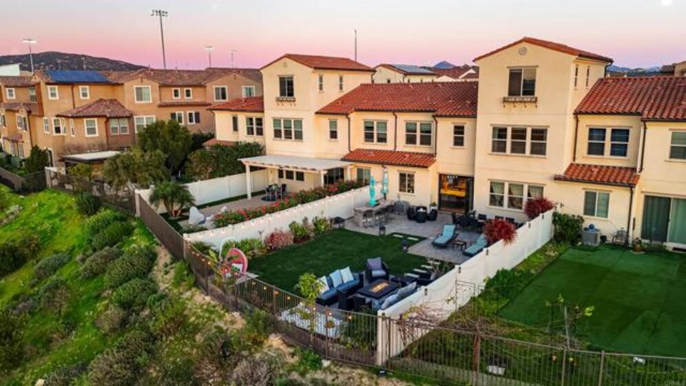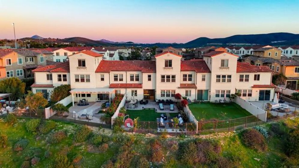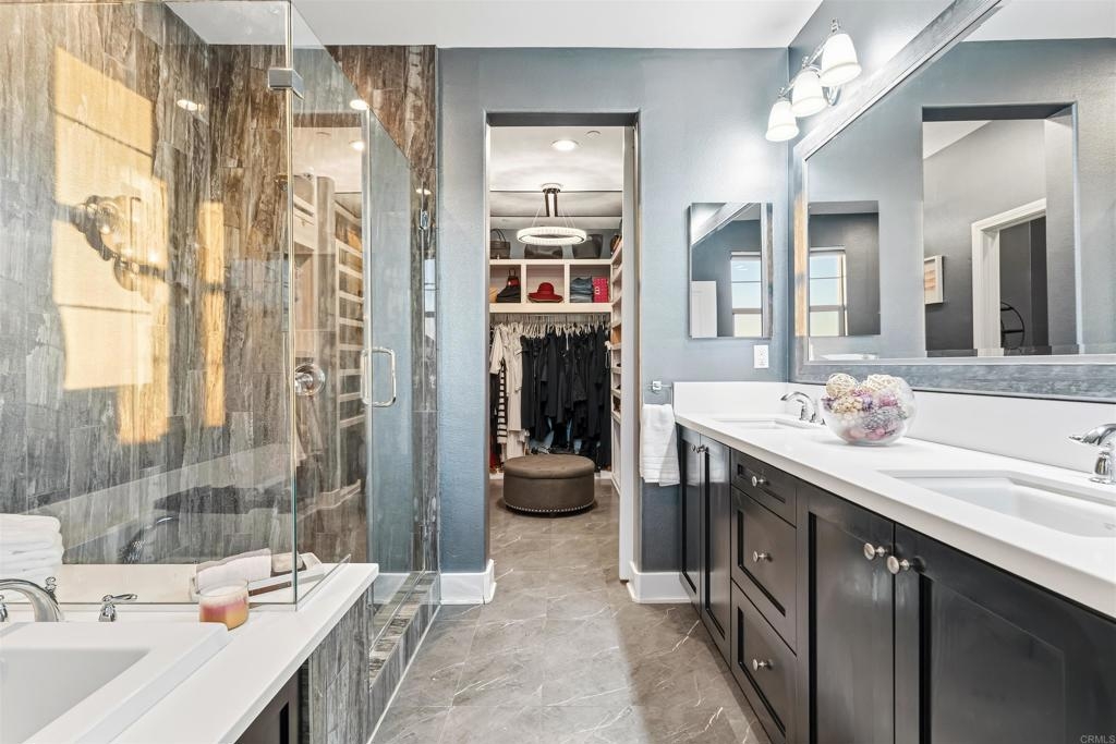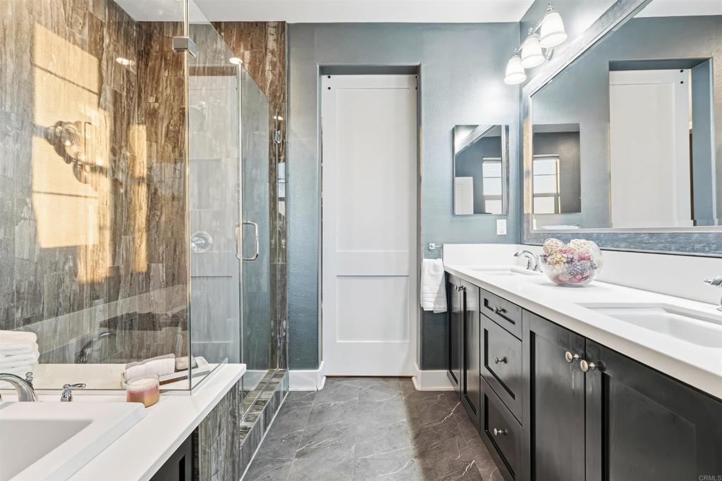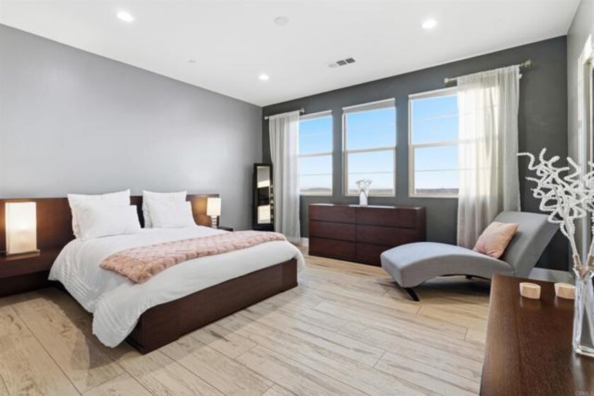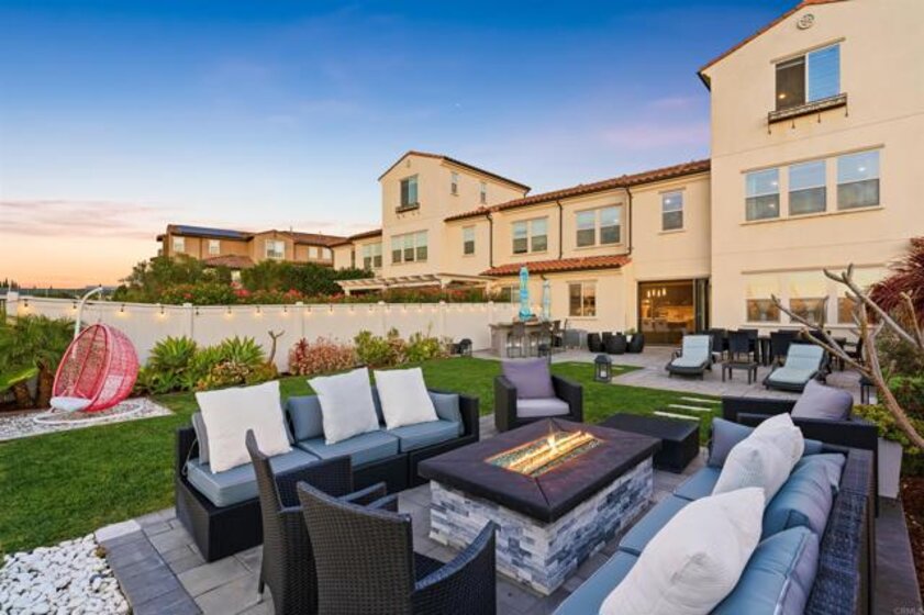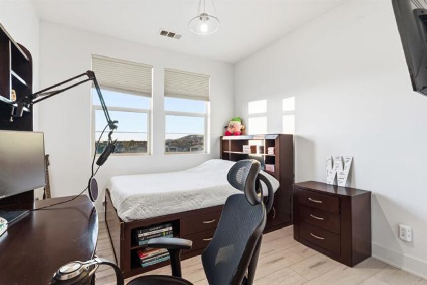 Exceptional 5 bedroom residence plus a third-floor loft located in the highly sought-after gated Veridian community of Black Mountain Ranch/Del Sur. Built in 2017, this beautifully designed home offers spacious, modern living with thoughtful upgrades and abundant storage throughout, including a convenient bedroom on the main level, ideal for guests, multi-generational living, or a home office. The open-concept main level showcases a chef’s dream kitchen featuring espresso cabinetry, sleek white and grey finishes, and an oversized island that comfortably seats eight, ideal for entertaining and everyday living. The contemporary color palette of crisp whites and soft greys creates a bright, modern aesthetic throughout the home. An upgraded French door opens effortlessly to the outdoors, creating seamless indoor/outdoor living and filling the home with natural light, perfectly setting the stage for the incredible backyard that follows. Step outside to a huge, professionally designed backyard featuring a built-in BBQ island, fire pit, outdoor dining area, and breathtaking panoramic canyon, mountain , and partial ocean views, an entertainer’s paradise and the perfect setting for relaxing or hosting gatherings. Upstairs, the primary suite is a true retreat, offering generous space, abundant natural light, and a luxurious, spa-inspired bathroom. The suite is complemented by a custom walk-in closet, designed with magazine-worthy detail and finished with a stylish barn door, providing exceptional organization and storage. Additional upstairs bedrooms are well-sized and thoughtfully laid out. The third-floor loft adds a versatile bonus space, perfect for a media room, gym, playroom, or private escape. A dedicated laundry room with sink and built-in storage adds everyday convenience. Additional highlights include a 2-car garage with overhead storage and ample storage solutions throughout the home. Located in a vibrant master-planned community with resort-style amenities, parks, trails, and access to the top-rated Poway Unified School District. This home seamlessly blends luxury, functionality, and exceptional indoor/outdoor living in one of North County San Diego’s most desirable neighborhoods.