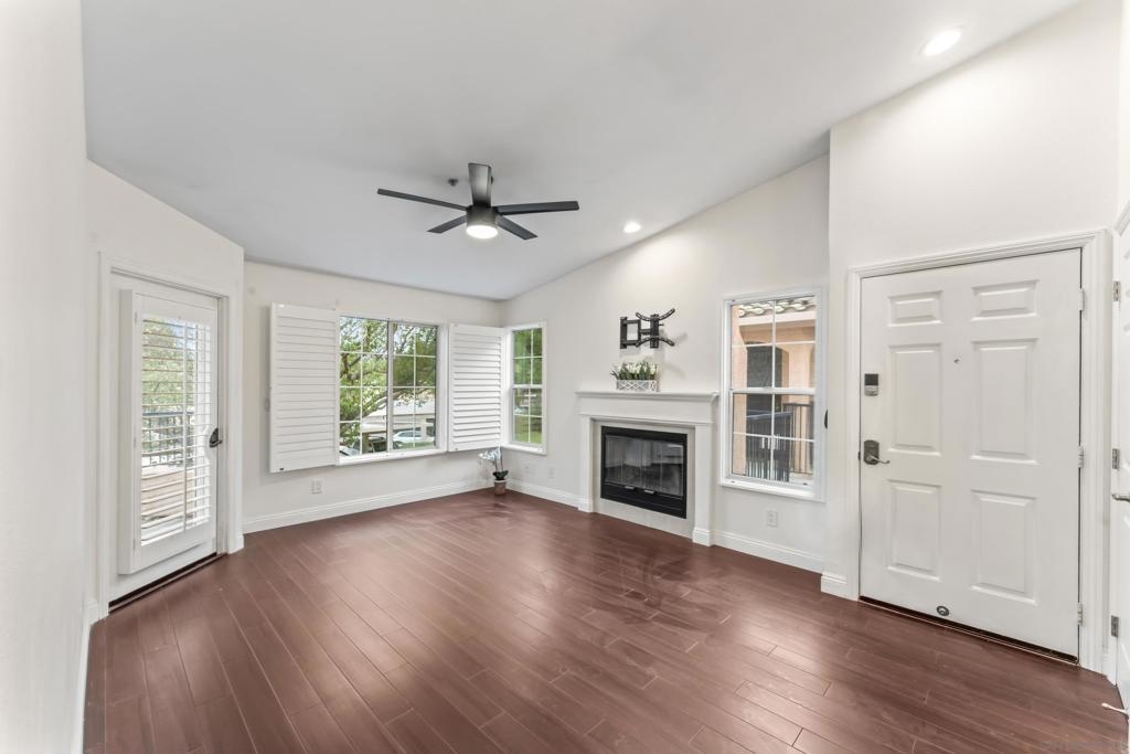 Stunning , sunny premier location, upper-level home welcomes you the moment you step through the door! Nestled in the highly sought-after gated community of Vista Del Lago, this beautifully/recently upgraded and meticulously maintained unit lives bigger than its size with the airy, vaulted ceilings and open space views! Dark Bamboo wood floors flow through the living room, dining area, hallway, & primary bedroom, complementing the custom-designed kitchen featuring new modern flooring and quartz counters, stainless steel sink and appliances. Unique to this unit is the large entry closet and additionally, a pull-down attic offers even more space for storing larger items. Primary walk-in closet has also been extended. Take in lush views from the private balcony. Assigned covered carport is directly in front. This home is a true gem! Schedule a tour today before someone else gets this beautiful move in ready home! Complex now approved for Fanny Mae and conventional lending. Come check out the Bernardo Vista Del Lago resort lifestyle complete with 2 community hot tubs, 3 pools (including 25-meter exercise lap pool), fully equipped exercise gym, pickleball, tennis, recreation room, duck pond and scenic hiking and biking trails. When you're done enjoying all of the community amenities, . Plenty of guest parking spots , as well as EV charging stations for convenience.