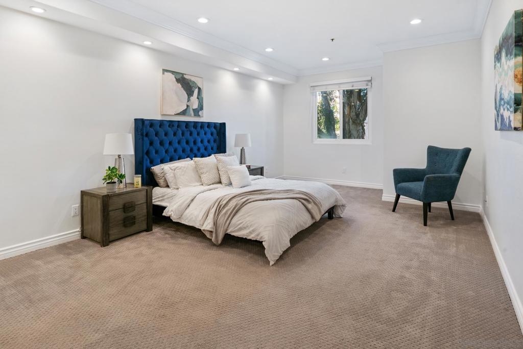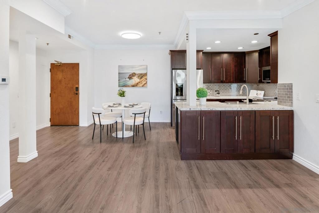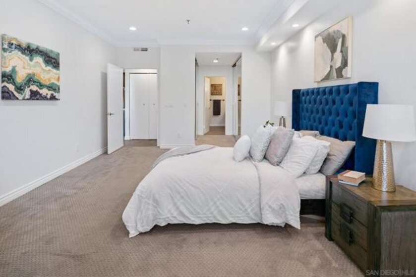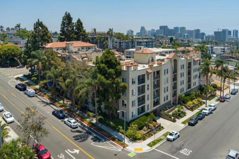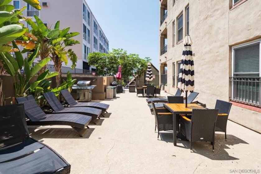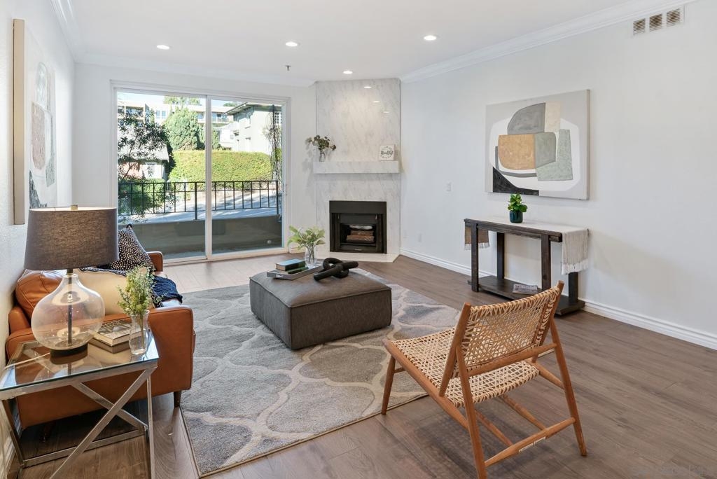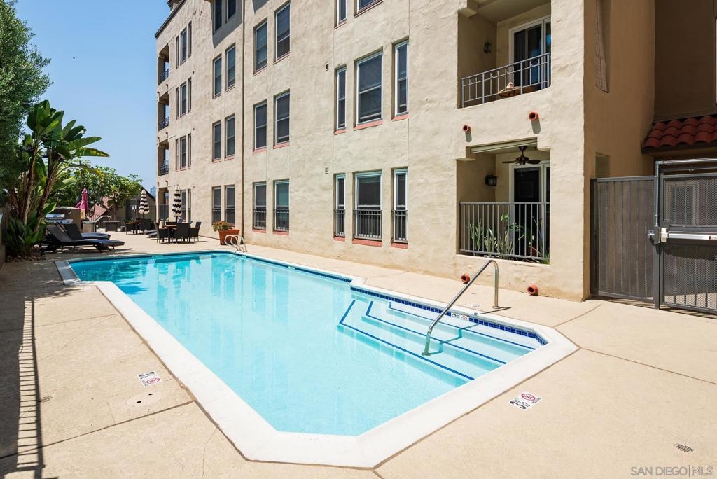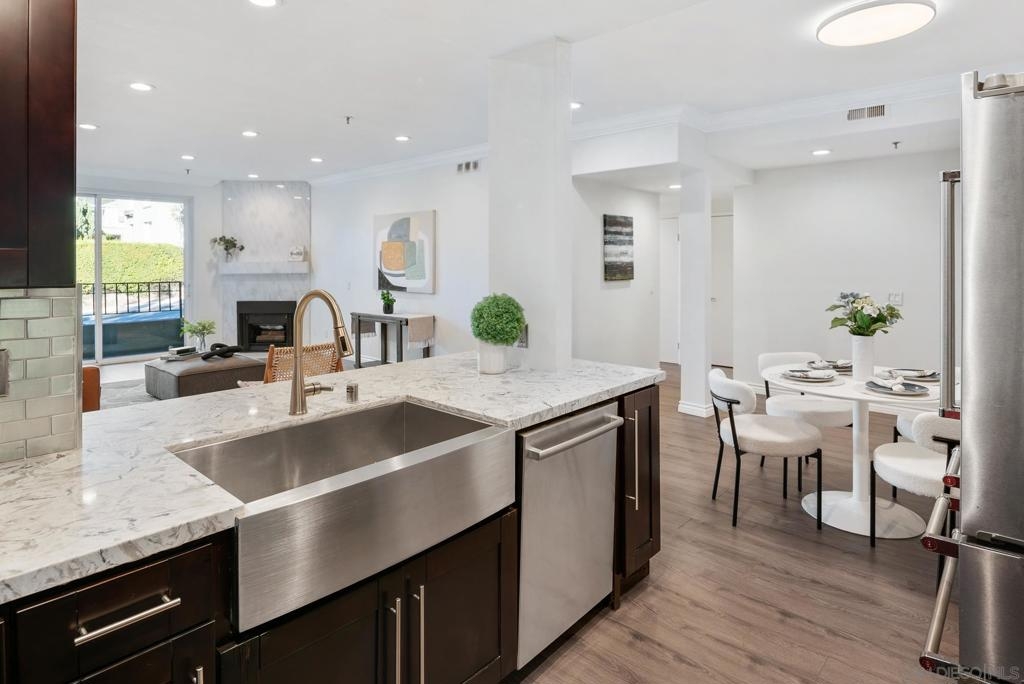 Welcome to luxurious urban living in the heart of Bankers Hill, where this spacious 2-bedroom, 2-bathroom condo offers the epitome of comfort and convenience. Boasting the largest floor plan in the building, this residence is designed for those seeking ample space and modern elegance. Upon entering, you're greeted by an open layout that seamlessly integrates the living, dining, and kitchen areas with a private balcony and fireplace. The kitchen is a chef's dream with high-end stainless steel appliances, complemented by a modern farm sink featuring a convenient touchless faucet. Sleek countertops and ample cabinetry provide both style and functionality. Located in highly desirable Bankers Hill, residents enjoy the convenience of walking to nearby attractions such as Little Italy, Balboa Park, and Waterfront Park. The building amenities include a refreshing pool, relaxing jacuzzi, and a well-equipped fitness room, catering to both relaxation and active lifestyles. Both bedrooms are generously sized, each featuring its own bathroom. The primary bedroom offers a luxurious shower, offering a spa-like retreat within your own home. The second bedroom features a jacuzzi tub with shower, a large built-in desk, and a spacious walk-in closet, ideal for those who work from home or need extra storage. Throughout the condo, you'll find wood laminate flooring, recessed lighting, and crown molding, creating a contemporary ambiance. Two reserved parking spots with additional storage complete this offering, ensuring convenience and security for your vehicles and belongings.