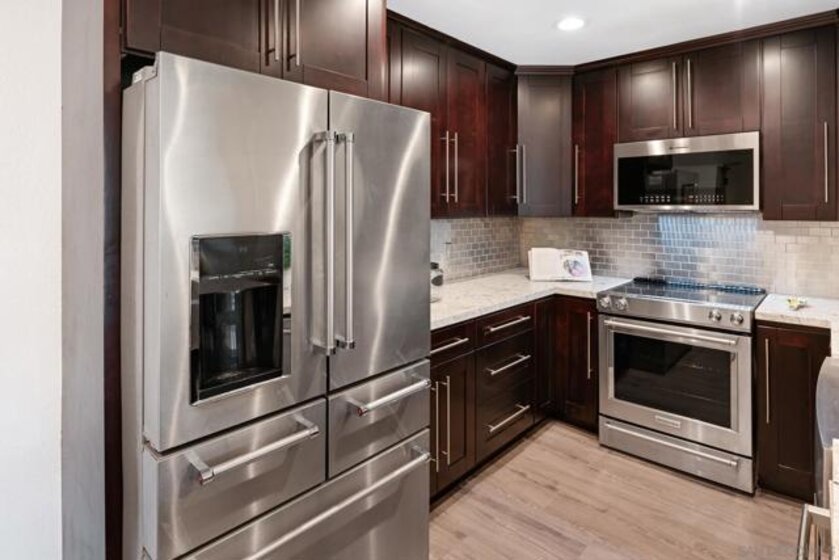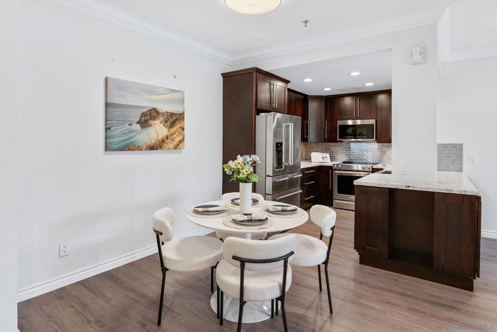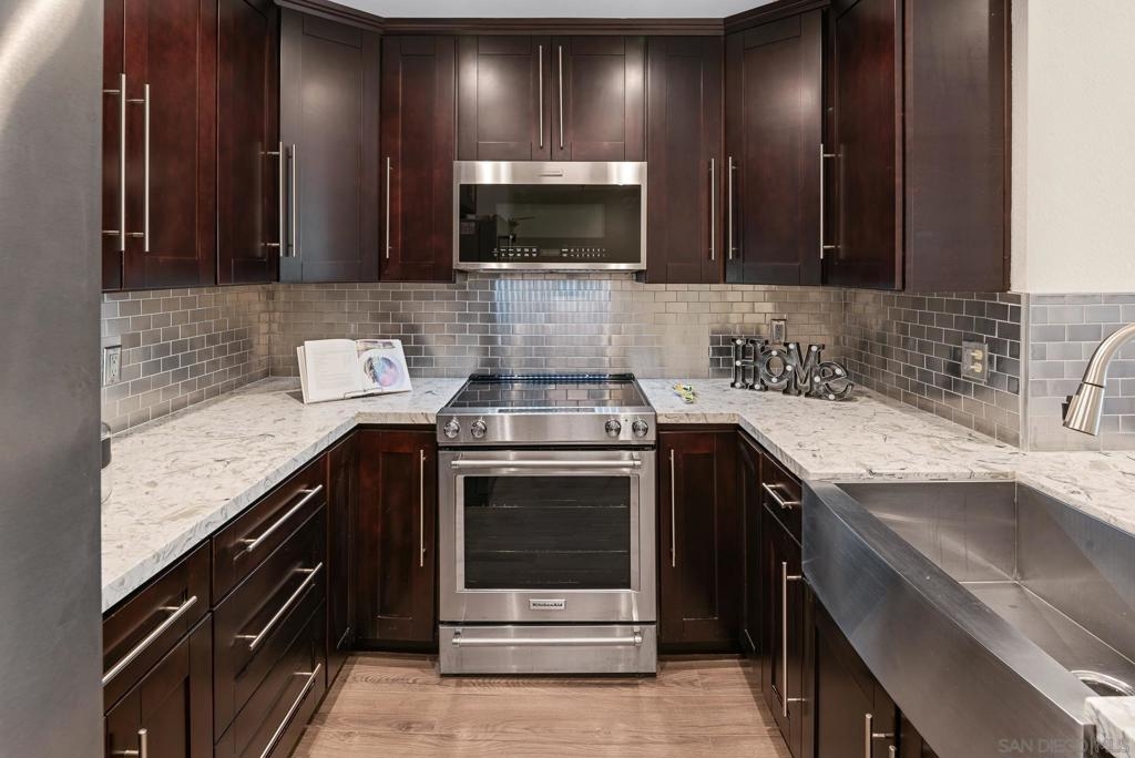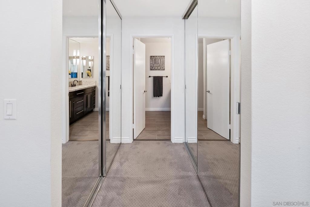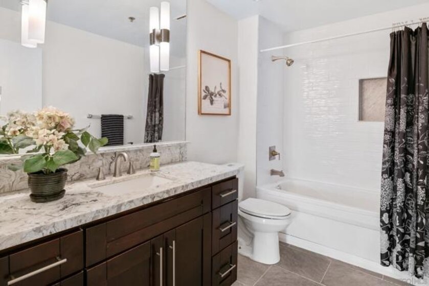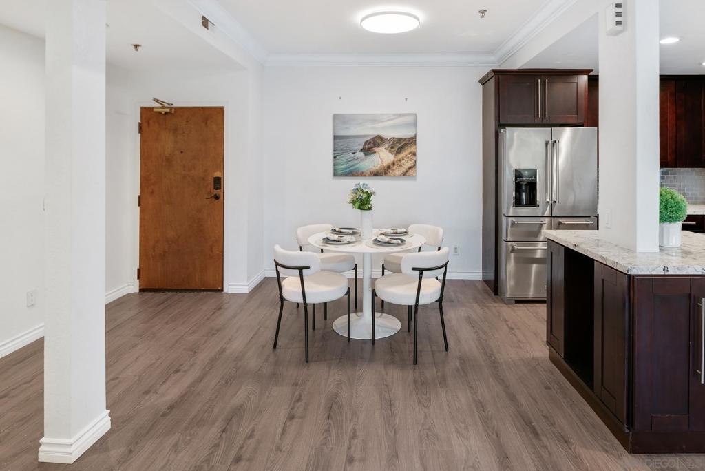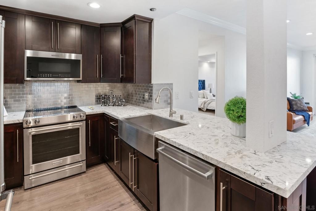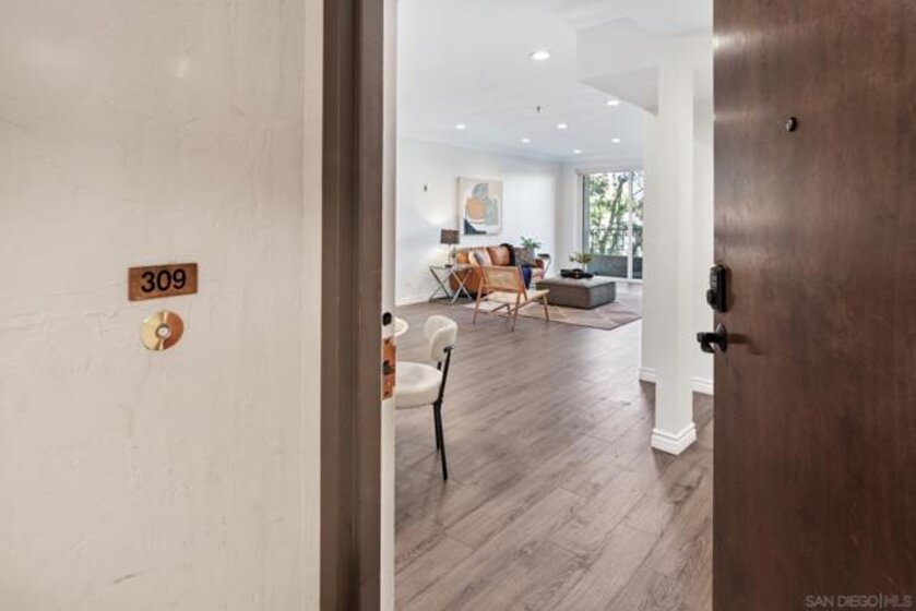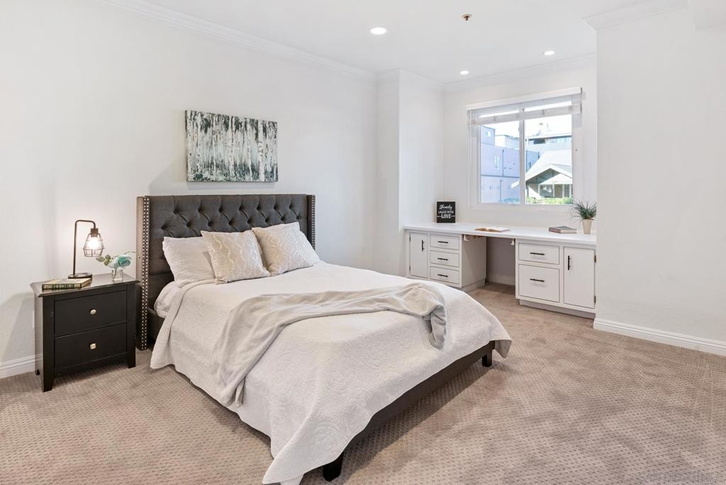 Welcome to luxurious urban living in the heart of Bankers Hill, where this spacious 2-bedroom, 2-bathroom condo offers the epitome of comfort and convenience. Boasting the largest floor plan in the building, this residence is designed for those seeking ample space and modern elegance. Upon entering, you're greeted by an open layout that seamlessly integrates the living, dining, and kitchen areas with a private balcony and fireplace. The kitchen is a chef's dream with high-end stainless steel appliances, complemented by a modern farm sink featuring a convenient touchless faucet. Sleek countertops and ample cabinetry provide both style and functionality. Located in highly desirable Bankers Hill, residents enjoy the convenience of walking to nearby attractions such as Little Italy, Balboa Park, and Waterfront Park. The building amenities include a refreshing pool, relaxing jacuzzi, and a well-equipped fitness room, catering to both relaxation and active lifestyles. Both bedrooms are generously sized, each featuring its own bathroom. The primary bedroom offers a luxurious shower, offering a spa-like retreat within your own home. The second bedroom features a jacuzzi tub with shower, a large built-in desk, and a spacious walk-in closet, ideal for those who work from home or need extra storage. Throughout the condo, you'll find wood laminate flooring, recessed lighting, and crown molding, creating a contemporary ambiance. Two reserved parking spots with additional storage complete this offering, ensuring convenience and security for your vehicles and belongings.