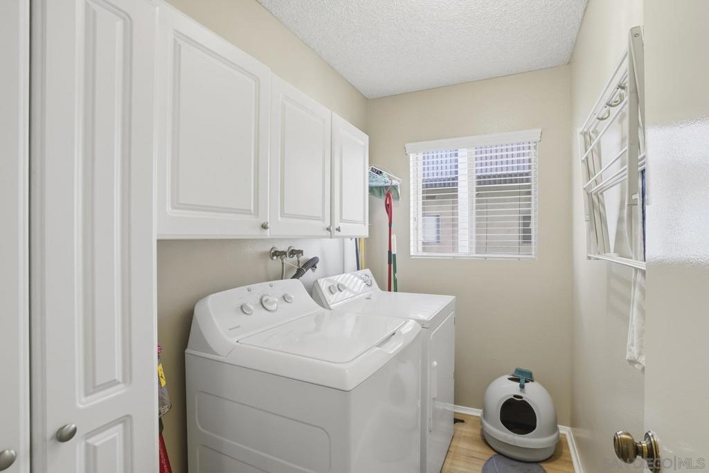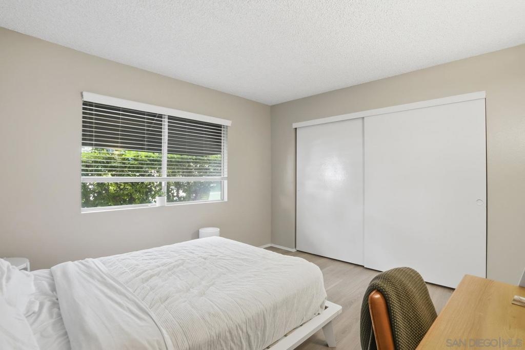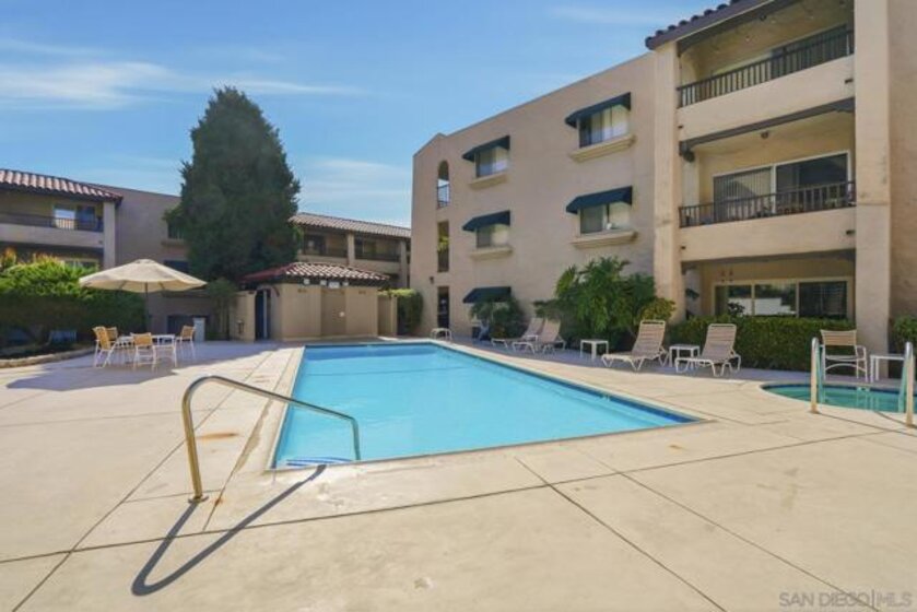 Ideal Home or Investment Opportunity, just minutes from Mission Bay, this desirable 2-bedroom, 2-bath single-level condo offers the perfect blend of comfort and convenience. Enjoy peaceful views of the pool area from your spacious private balcony in this end-unit home with no neighbors on either side. Inside, you’ll find upgraded appliances, new luxury vinyl flooring, window treatments, newer oversized sliding glass doors for natural light, and neutral tones throughout the open-concept living and dining areas—ready for your personal coastal touch. The modern kitchen comes fully equipped with newer appliances including an electric range, refrigerator, and dishwasher, perfect for everyday cooking or entertaining. The primary suite features a remodeled walk-in shower and an expansive walk-in closet, while the rare in-unit laundry room adds extra convenience and storage. Located in a highly sought-after gated community, residents enjoy two sparkling pools, relaxing spas and elevator access. The unit also includes two side-by-side covered parking spaces with storage. With easy freeway access, you’re just minutes from Mission Bay, local beaches, dining, and shopping. The nearby Clairemont Blvd Blue Line Trolley offers quick connections to UCSD, UTC, Downtown, and beyond.