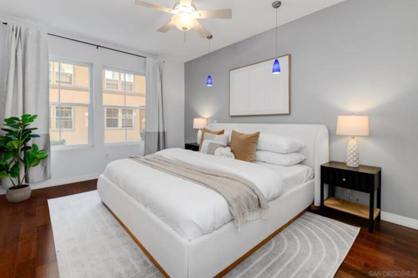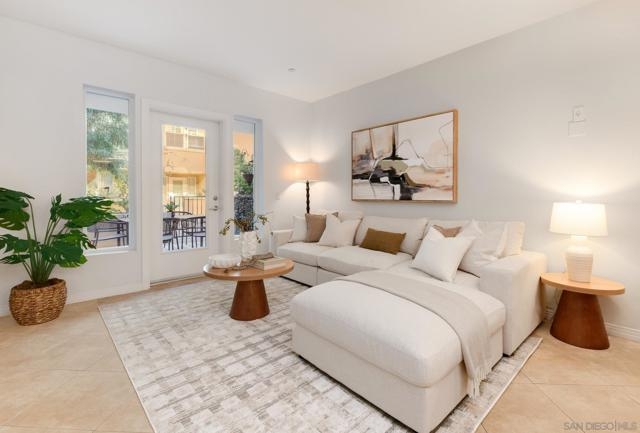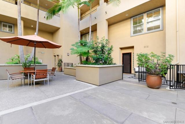 Experience the Best of Indoor-Outdoor Living in the Heart of the Marina District! This impeccably maintained 2-bedroom, 2.5-bathroom townhome at City Walk offers the perfect blend of style, privacy, and convenience. Captivating with its Mediterranean-inspired architecture and two expansive private patios, this rare residence is one of only 12 unique internal townhome-style units in the community. The main level features an open-concept living and dining area that flows seamlessly to both patios, perfect for embracing San Diego’s indoor-outdoor lifestyle. Enjoy solid wood and porcelain tile flooring, in-unit laundry, and generous under-stair storage. The kitchen includes a gas cooktop and an oversized dining bar that opens to the living area, with access to an enclosed private terrace. Upstairs, both bedrooms are thoughtfully designed for comfort and both feature en-suite bathrooms. The spacious primary suite includes a walk-in closet with custom built-ins from The Container Store. This home is set within the beautifully landscaped City Walk, a community offering tranquil courtyards with fountains and waterfalls, fire pits, lounge areas, a fitness center, and reservable spaces with kitchens for private gatherings and all with low HOA dues. Located just steps from Pantoja Park, Seaport Village, Little Italy, Gaslamp Quarter, The SHELL, Petco Park, and trolley stations, this home offers walkable access to everything Downtown San Diego has to offer-while still providing a peaceful, residential atmosphere.