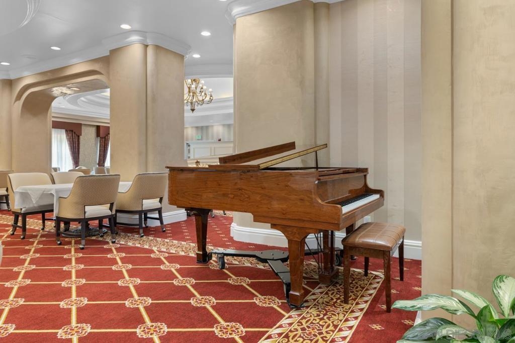 Welcome to 3890 Nobel Dr Unit 1205, a 2-bedroom, 2-bathroom condo in the Pacific Regent community. Pacific Regent is a luxury retirement community for those aged 62 and up, offering an array of amenities. Enjoy 24-hour security, a salon, and a library for convenience. The HOA includes access to a fitness center, heated pool and spa, and meeting rooms for events. Indulge in gourmet restaurant-style dining and room service.