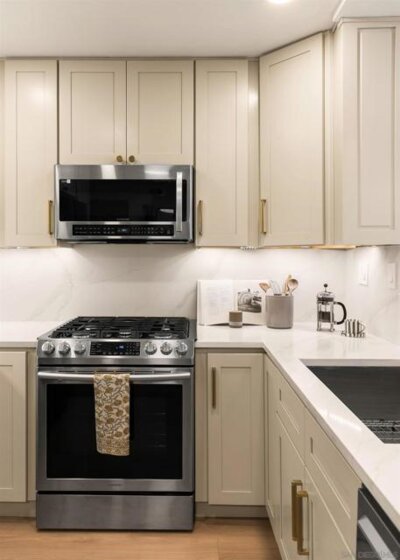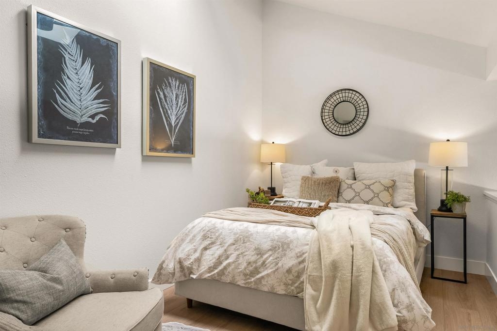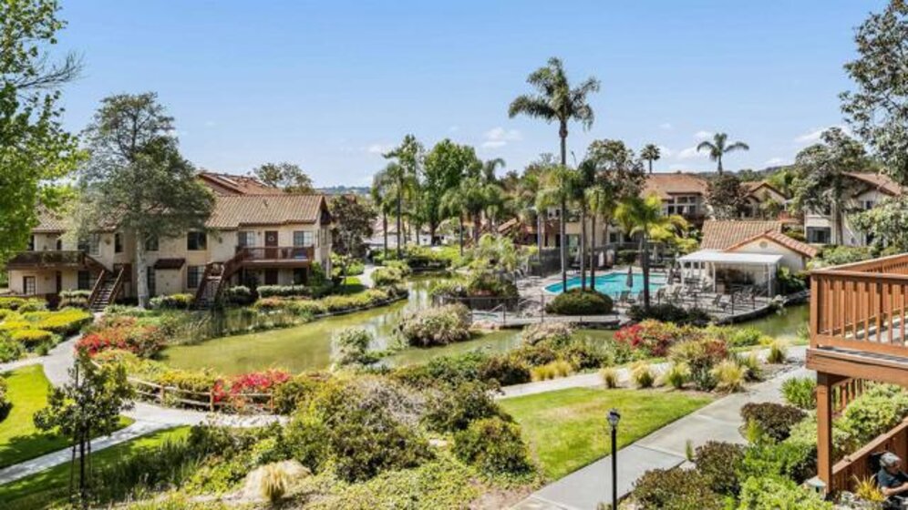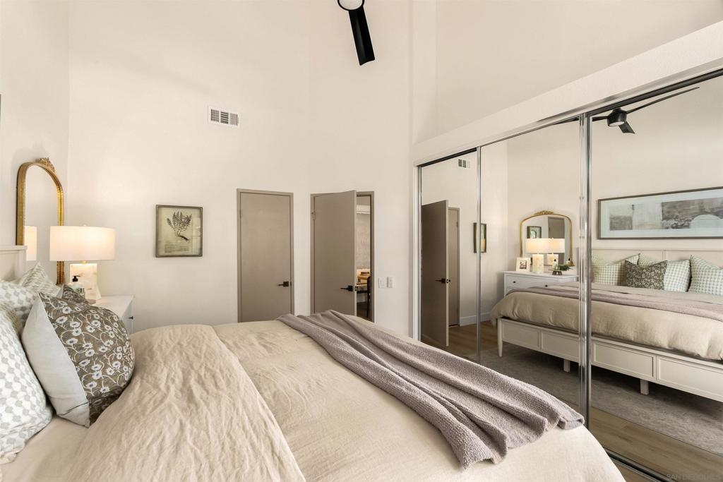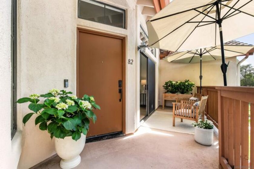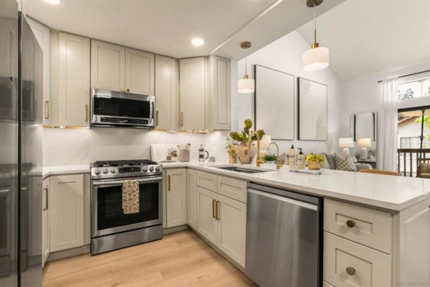 Introducing this fully remodeled top-floor unit in the highly desirable Arborlake community of Carmel Del Mar. Thoughtfully upgraded from top to bottom, this unit lives like a two-bedroom, offering a one bedroom with a spacious loft perfect for a guest room, office, or flex space. As you walk in, you are greeted with high vaulted ceilings, an open layout with ample natural light, new wide-plank flooring, and a sleek electric fireplace that anchors the living room. The fully remodeled kitchen is a true showpiece, featuring quartz countertops, extended peninsula with bar seating, premium Samsung stainless-steel appliances with gas range, custom cabinetry with designer hardware, and layered lighting: recessed, designer pendants, and under-cabinet lighting. The custom-designed bathroom showcases elegant tilework, a glass-enclosed shower, and an oversized vanity for added counter space. The primary suite boasts vaulted ceilings, a modern ceiling fan, large windows with blackout shades, and a generous closet. Head upstairs to the spacious loft for the perfect guest room or office with direct access to a private, oversized storage room that is rare to find in condo living. Additional highlights: stackable washer/dryer, fresh interior paint, a reverse osmosis water system, and 1 assigned covered parking spot plus guest parking. Arborlake boasts lush grounds, koi ponds, heated pool, two spas, clubhouse, BBQ areas, and tennis courts. Ideally located near Del Mar Highlands Town Center and One Paseo, as well as top-rated schools, beaches, parks, and quick freeway access.