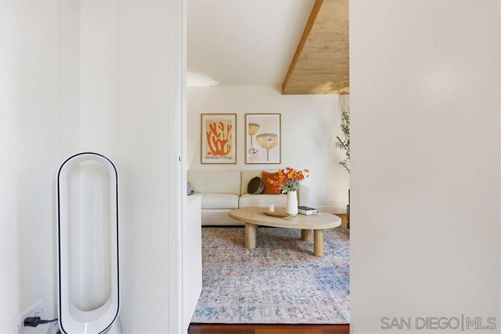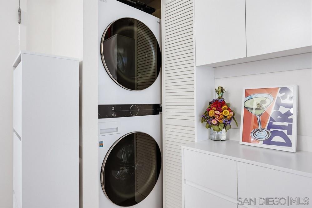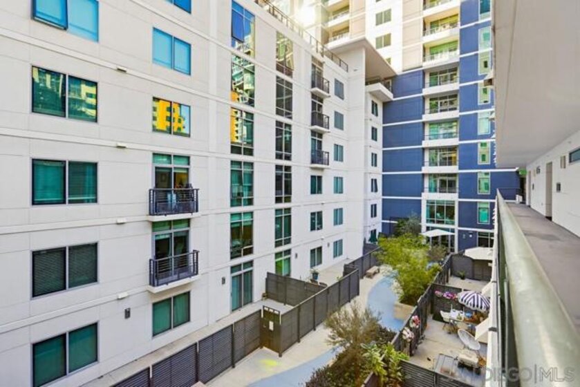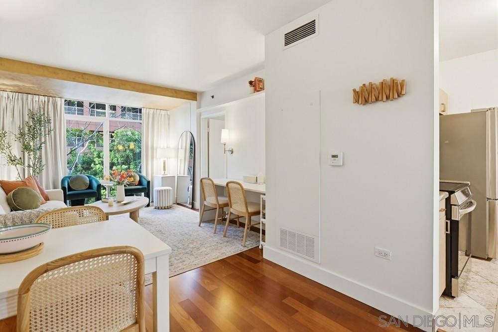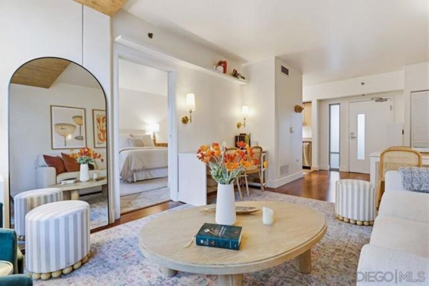 Sophisticated and serene, this private and quiet 4th-floor residence has been thoughtfully upgraded and features all-new LG appliances (Sept. 2024), including an induction range, refrigerator with ice maker and filtered water, microwave, quiet dishwasher, and in-unit washer and dryer—all included. Additional updates include a new garbage disposal (2026), hardwood flooring in the main living areas, travertine bedroom flooring, fresh paint, custom ceiling details, built-in shelving, light dimmers, blackout drapes, air conditioning, and a custom Elfa closet system with lighting. The upgraded kitchen showcases modern cabinet hardware, trash pull-out, and contemporary lighting, while the bathroom offers new fixtures, a large modern mirror, shelving, luxury filtered shower head, and dimmer lighting. Acqua Vista delivers resort-style amenities including valet parking, rooftop pool and spa, fitness center, BBQs, fire tables, EV charging, Amazon lockers, bike storage, full-time security, 24-hour concierge, and an on-site HOA manager, with additional parking available. Steps from the Little Italy Farmers Market, top-rated dining, and the waterfront, this home is ideal as a primary residence, second home, or investment opportunity.