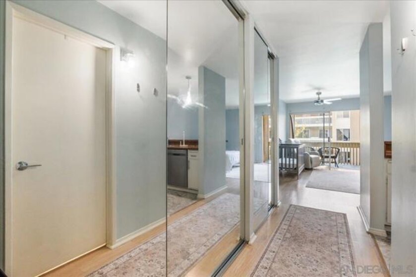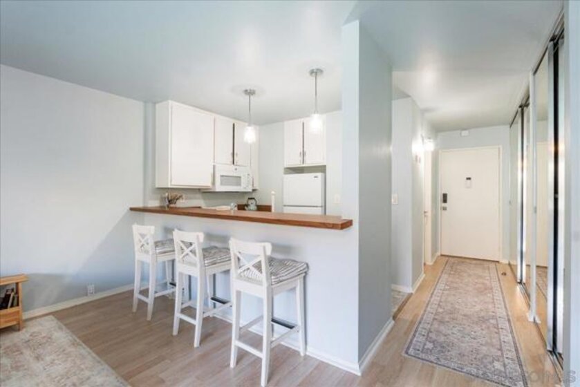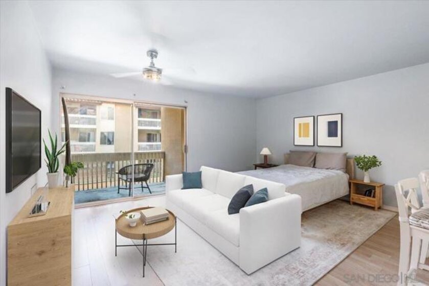 Charming and well-maintained studio condo in the heart of highly desirable Pacific Beach, San Diego. This bright, south-facing unit is filled with natural light and features sleek laminate flooring and an efficient open layout designed for comfortable, functional living. The kitchen includes a dishwasher, refrigerator, and bar-style seating perfect for casual dining or entertaining. Step onto your private balcony to enjoy fresh air and serene views of the pool and garden. The community offers resort-style amenities, including a heated pool, spa, sauna, fully equipped gym, clubhouse, and tennis court. Additional conveniences include assigned garage parking, on-site laundry, and easy elevator access. Minutes from Mission Beach, Seaworld, La Jolla and Kate Sessions Park.