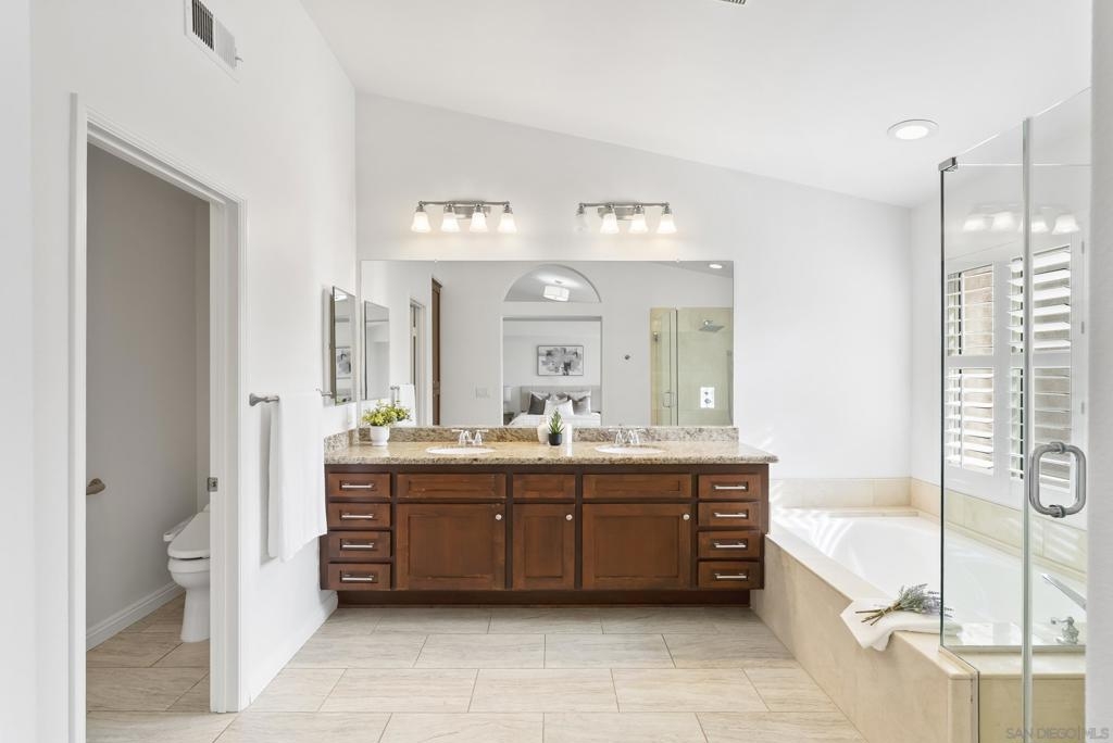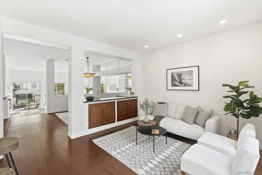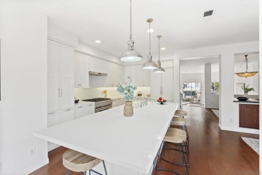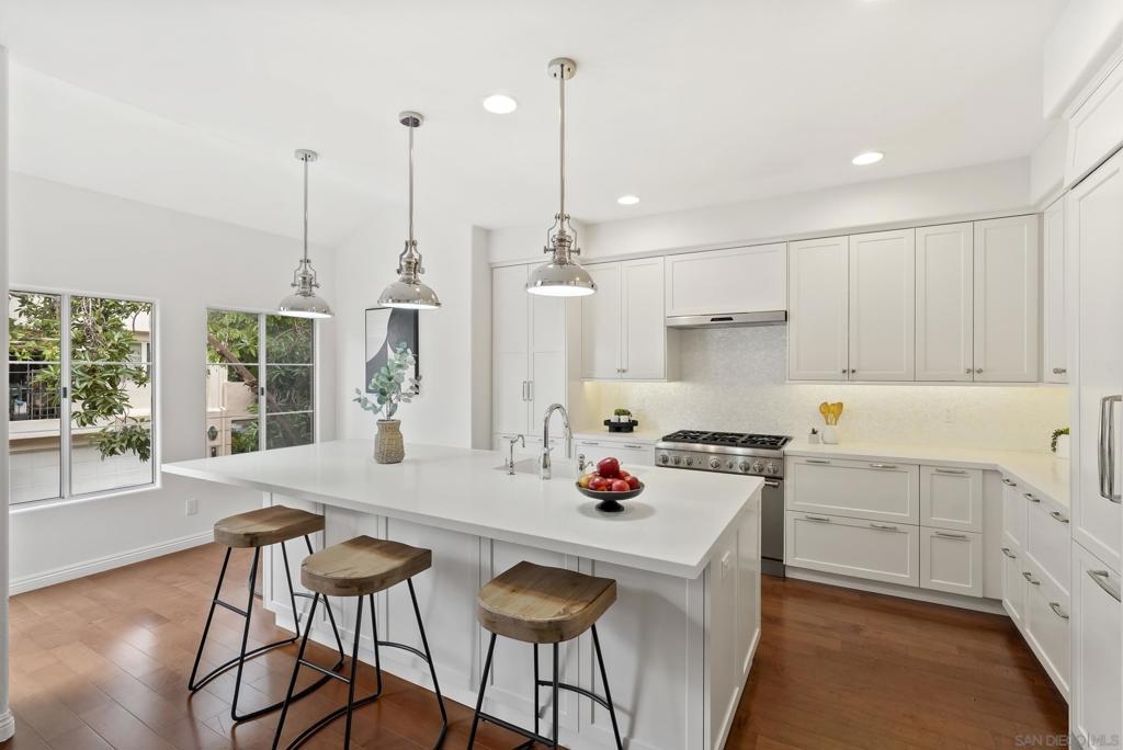 Tucked inside the gated La Florentine community at Renaissance, this refined townhome offers a peaceful setting in a beautifully maintained Italian inspired village in the heart of UTC. The interior showcases an airy, open layout with soaring ceilings, recessed lighting, a tiled fireplace, and fresh interior paint that creates a bright, cohesive feel. The remodeled kitchen blends style and function with custom white cabinetry featuring built in drawer organizers, quartz countertops, an expansive island, and premium appliances, making it ideal for both everyday living and entertaining. A spacious south facing front patio welcomes abundant sunshine and provides an inviting setting for outdoor dining, weekend barbecues, or a quiet morning coffee. The primary suite serves as a private retreat, complete with its own balcony, walk in closet, and an upgraded bath featuring a soaking tub, tile flooring, dual vanities with granite counters, and a separate tiled shower. Additional features include an oversized two car garage with storage on the lower level and access to community amenities such as a pool and spa. Centrally positioned in UTC, residents enjoy convenient access to a wide selection of restaurants, the UTC shopping center, neighborhood parks and walking paths, as well as close proximity to beaches, UCSD, and highly regarded San Diego Unified schools.