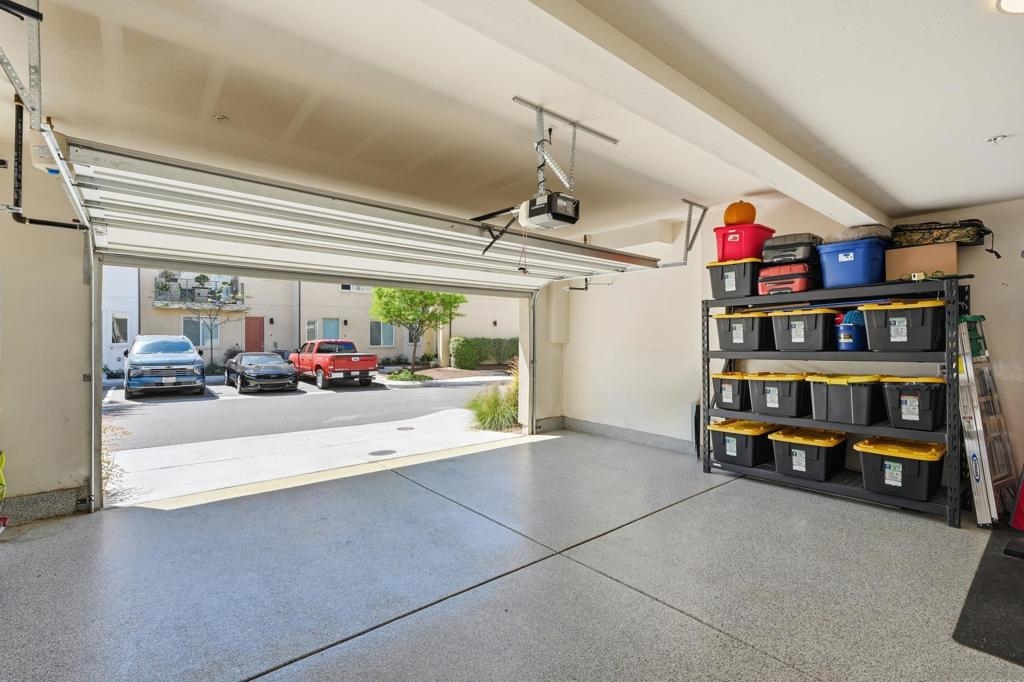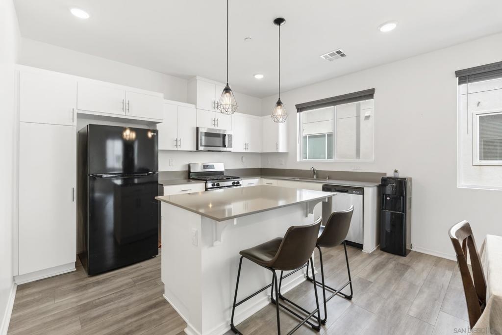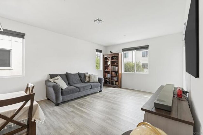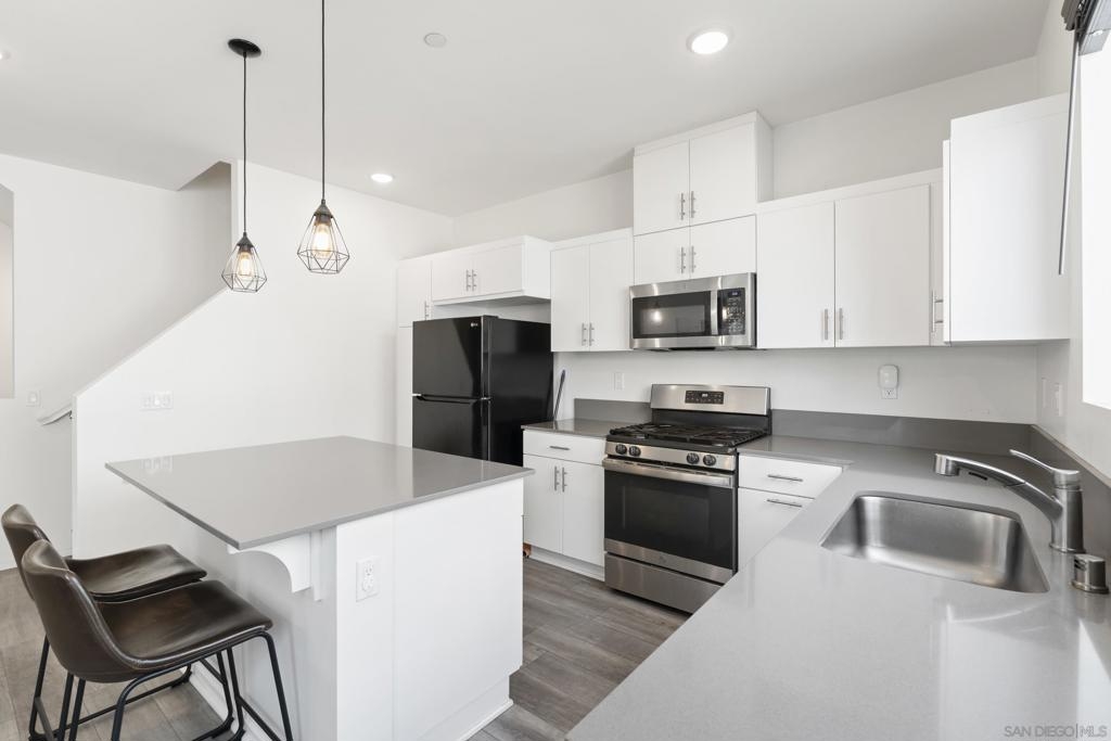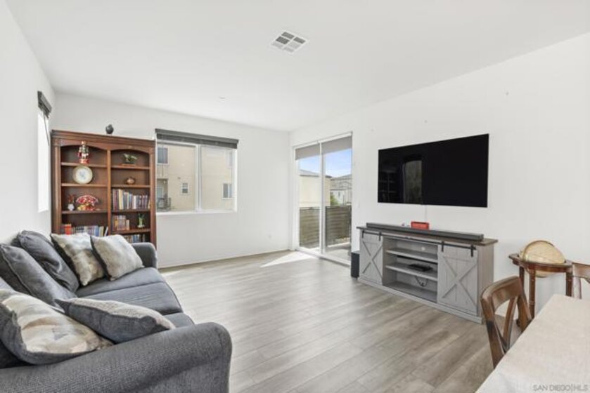 Step into this bright, beautifully updated 1,321 sq ft townhome and feel instantly at home. Featuring an open-concept design, high ceilings, and abundant natural light, this modern three-story condo offers the perfect blend of style and everyday comfort. The spacious living room flows seamlessly into the dining area and open kitchen. Built in 2021, the home has a clean, contemporary feel throughout. The kitchen is equipped with stainless-steel appliances—including a gas range and built-in microwave—along with a generous pantry and a large breakfast bar, making meal prep easy and enjoyable. A sliding glass door opens to your private balcony, perfect for relaxing with a view of the community grounds. Upstairs, you’ll find two generously sized bedrooms, each with its own bathroom, plus a full-size stacked washer and dryer for convenience. Additional highlights include an attached two-car garage with built-in storage shelving and epoxy flooring, fresh neutral paint, wood-look flooring throughout, and contemporary lighting. The home is move-in ready with recent updates and low-maintenance living. Located in a highly convenient spot, you’re just minutes from the 905 and 805 freeways, making commuting effortless. Community Amenities: The community features a full-sized pool, grilling area, jacuzzi, and a park for kids and dogs. - Smart Home Features: The home includes apps to control the garage, kitchen lights, and HVAC system. The electric water heater can also be controlled remotely with the press of a button.