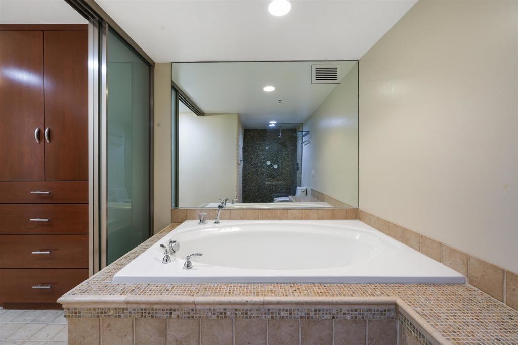 Don't miss this rare opportunity to own a private ground floor corner unit that is also the largest 3 bedroom floorplan at Presidio Place. This gorgeous home has abundant light from all of the windows, a beautiful open floorplan with upgraded kitchen - including a double oven and granite countertops! Pergola flooring throughout this home leads you through a dining room and large family room with sliding doors to a wrap around patio and even a lawn! In the family room you'll find a beautiful wet bar and fireplace. As you make your way down the hall you'll find updated hall bathroom and bedrooms with built in closet organizers. At the end of the hall you'll find the spectacular primary suite. Stunning wood cabinets and large walk in closet with built in organizers boast an abundance of storage. The updated primary bathroom make this a spa experience with a soaking tub and custom tiled separate walk-in shower. This home also comes with 2 assigned parking spots directly across from the elevator and is located steps across from the elevator on the 1st floor.....All of this in the heart of San Diego minutes away from dining, entertainment, shopping, beaches and even the airport. Presidio Place boasts 24/7 security with guard on-site, a heated pool you can use year-round and discount membership to state of the art gym at the YMCA (Did someone say Pickleball??). Also included in the HOA fee is your gas, water, trash, and sewage. This truly is a rare opportunity to live near everything but be in your own your quiet private oasis.
