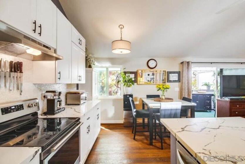 Stunning top floor unit nestled in University City! This gorgeous 1br/1ba unit features a GOURMET kitchen w/newer cabinets, quartz counters & stainless steel appliances. Vaulted ceilings, luxury vinyl floors, updated bath, 1 garage space & permit pkg spot. When you step in the door you will be impressed! The large balcony overlooks trees & greenery. This centrally located beauty is close to the beach, freeways, shopping, public library & food. The complex is well maintained & has a sparkling pool. Why on earth would you rent, when you could call this home?!!