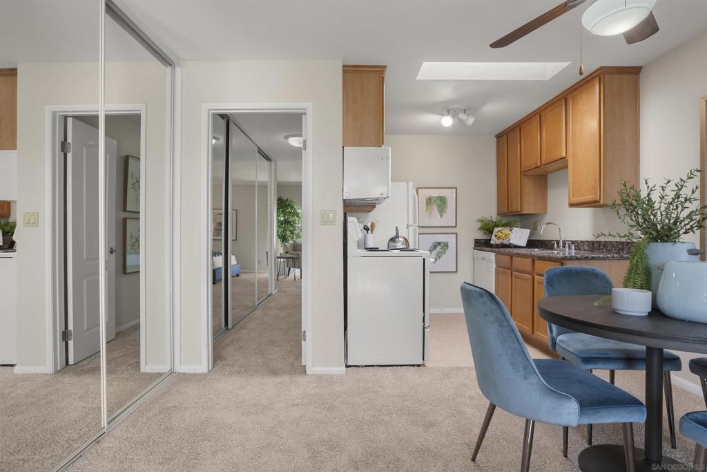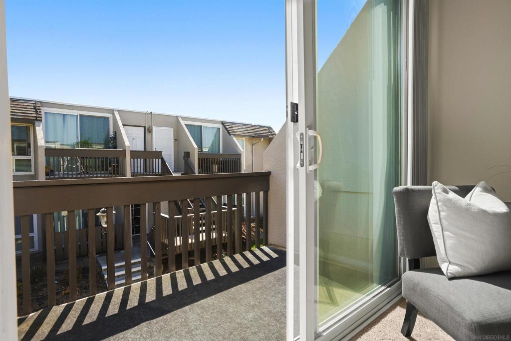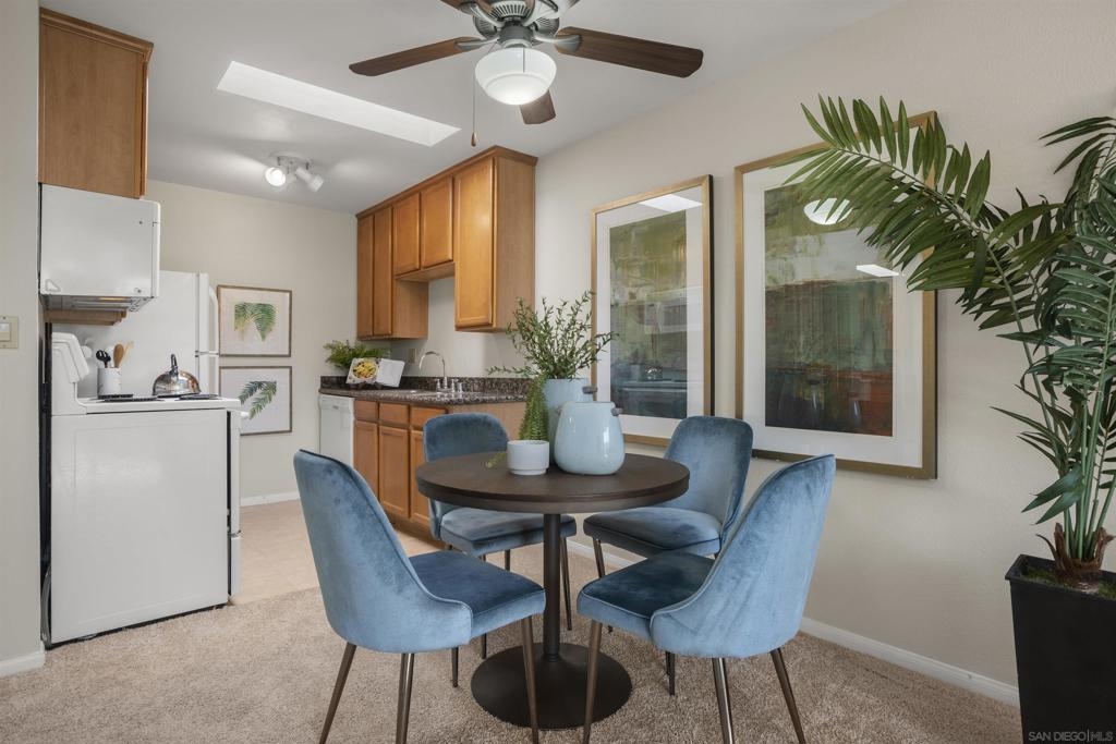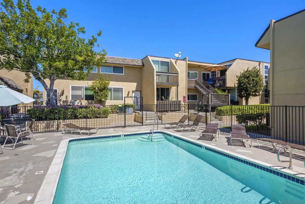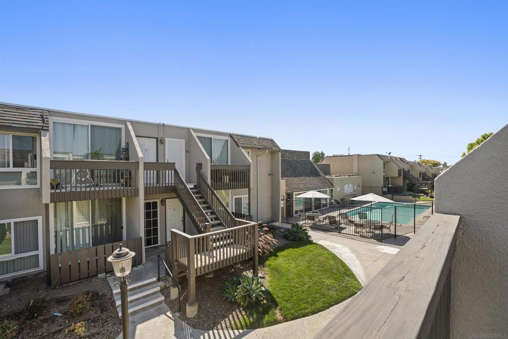 Light, bright & airy! This terrific top floor unit is located in the heart of Clairemont close to shopping, schools & just a short drive to the beach. The unit features a wonderful open concept layout, vinyl windows, fresh paint & new carpet. The kitchen boasts maple cabinets with granite counter tops. Tons of natural light streams into the unit from both the newer skylight above the kitchen & the large vinyl slider that leads to the balcony. The complex has a well maintained exercise room & a terrific pool. Welcome home!