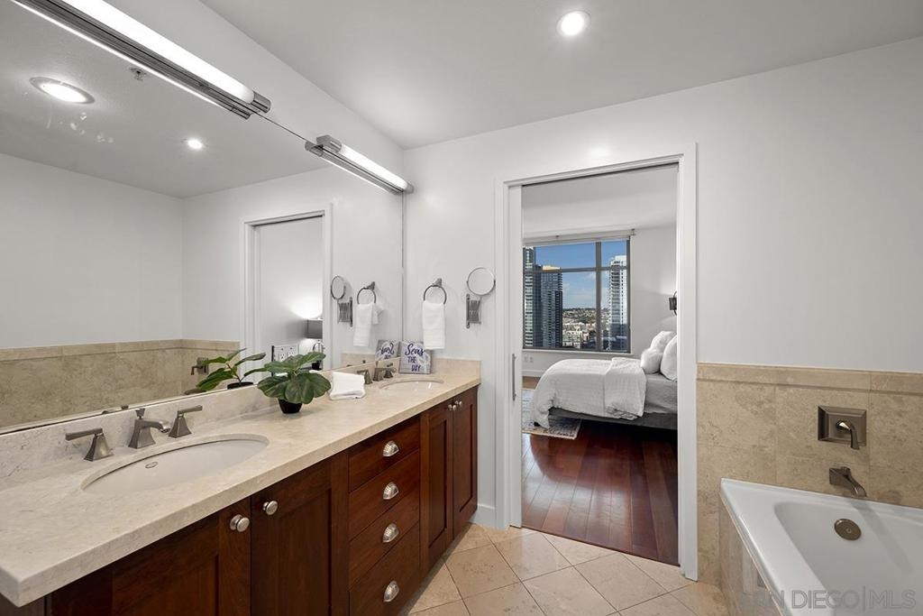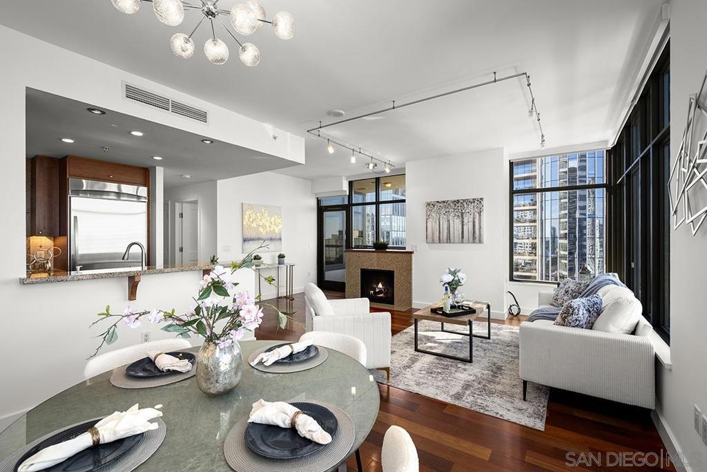 Don’t miss this fabulous northwest corner residence at Electra, well maintained for the discerning buyer! Showcasing Bay, Point Loma, and cityscape views from the many windows as well as the private balcony: the ideal place for trademark sunset evenings. The desirable split-bedroom layout is complemented by engineered cherry wood flooring, track lighting, and an ambient fireplace in the living room, creating a comfortable retreat above the city. Enjoy sit down meals in the dining area while the kitchen features granite countertops, stainless appliances, and recessed lighting, making it perfect for both everyday living and entertaining. The primary suite enjoys gorgeous views and an ensuite bath with dual vanity, step-in shower, and deep soaking tub. The second bedroom offers a built-in executive desk area and easily functions as a guest room, office, or flex space. Additional highlights include custom Elfa closet organization throughout, a generously sized utility/laundry room, extra storage space, and two parking spaces (tandem). Offering a fabulous location in the coveted Columbia District, you will love being only a short walk to Waterfront Park, Seaport Village, The Headquarters, vibrant Little Italy, and much more. Offering a fabulous location in the coveted Columbia District, you will love being only a short walk to Waterfront Park, Seaport Village, The Headquarters, and the brand-new Rady’s Shell at Jacobs Park, a unique live music venue and home of the San Diego Symphony! Also enjoy proximity to the future life science and biotechnology research development The Research and Development District (The RaDD) at the Embarcadero and the sustainable tech-focused Horton Plaza Redevelopment in the center of the city. Electra has the unique distinction of being built around the historical 1928 SDG&E Station B. Residents can take advantage of an array of services including a concierge, security, and guest parking spaces available by reservation through a simple mobile app. Unwind and relax in the steam room or sauna, resort-style pool and spa, fitness center, and Electra Park on the 5th floor surrounded by lush landscaping and a romantic outdoor fireplace and top-of-the-line barbecues.