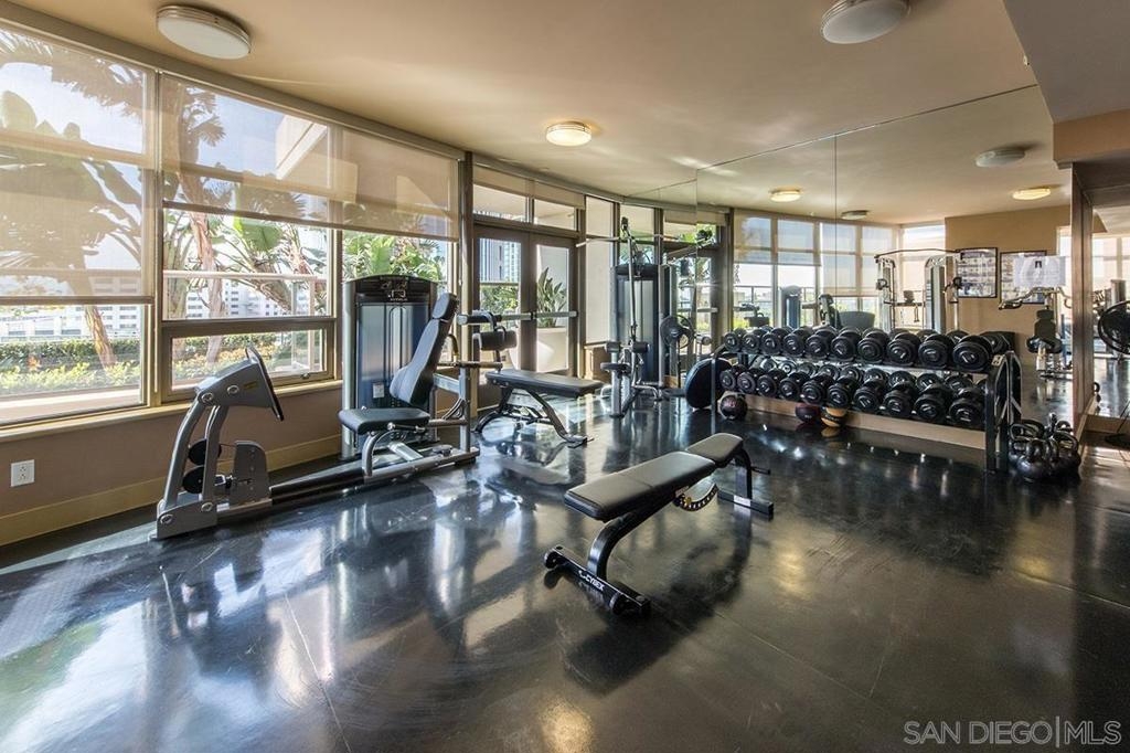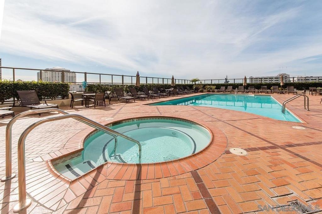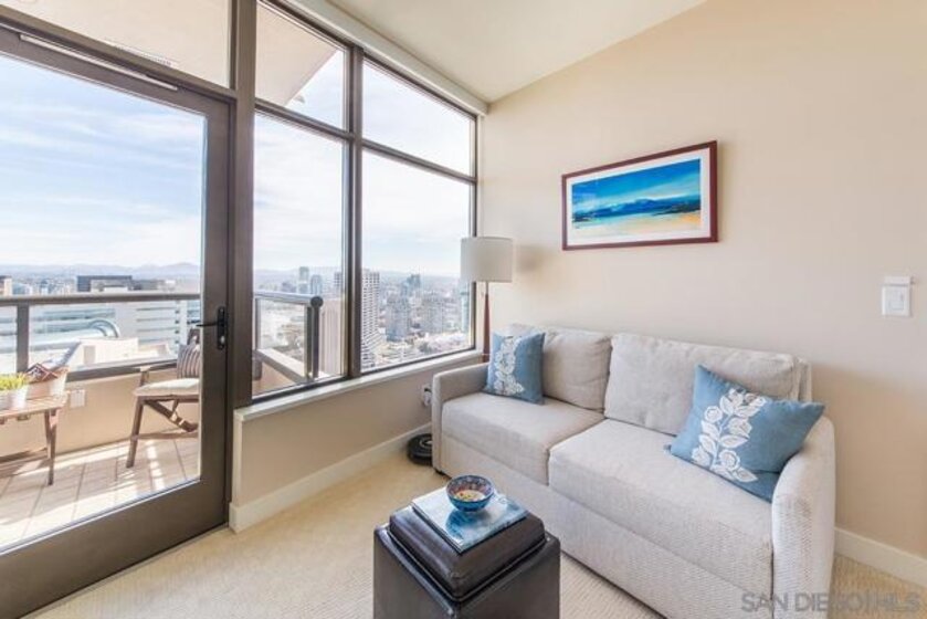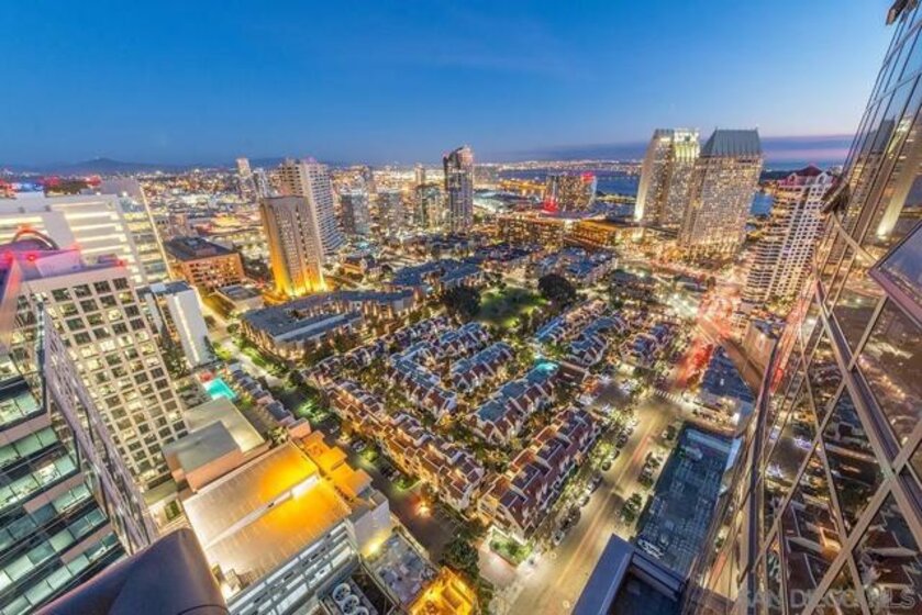 Stunning, unobstructed panoramic views stretch from the mountains across San Diego Bay to the Coronado Bridge! The home features Brazilian cherry hardwood floors, fresh interior paint, sleek murphy bed, granite countertops, custom tile backsplash, high-end stainless-steel appliances, Bosch washer/dryer, private storage unit & dedicated parking space upgraded with personal EV charging! Additional highlights include a NEST smart home system, custom closet organizers, an eat-at kitchen bar, and a dedicated storage unit in the underground garage. Electra offers full-service, resort-style amenities including a state-of-the-art fitness center with men’s and women’s locker rooms, pool and spa, steam room, Swedish sauna, concierge services, outdoor BBQ area, and an elegant community room, all within a secure, gated building. A desirable split floor plan provides excellent privacy, with a guest bedroom featuring its own private balcony with amazing views!