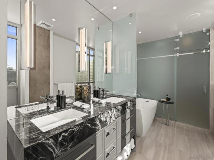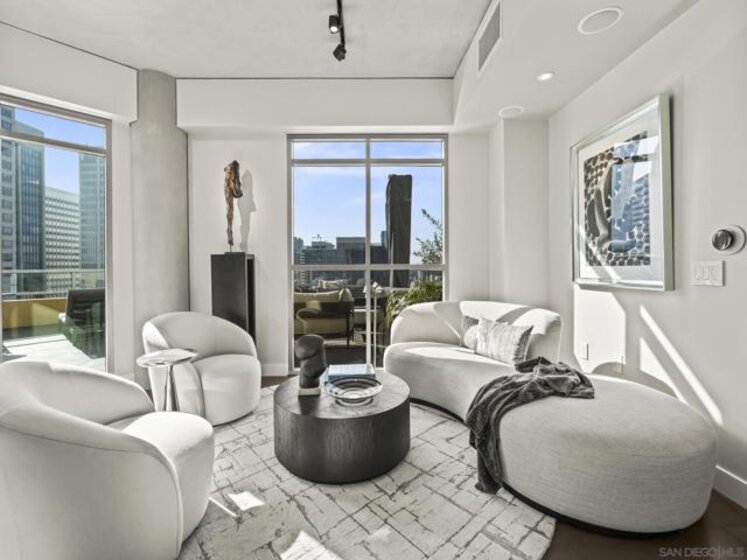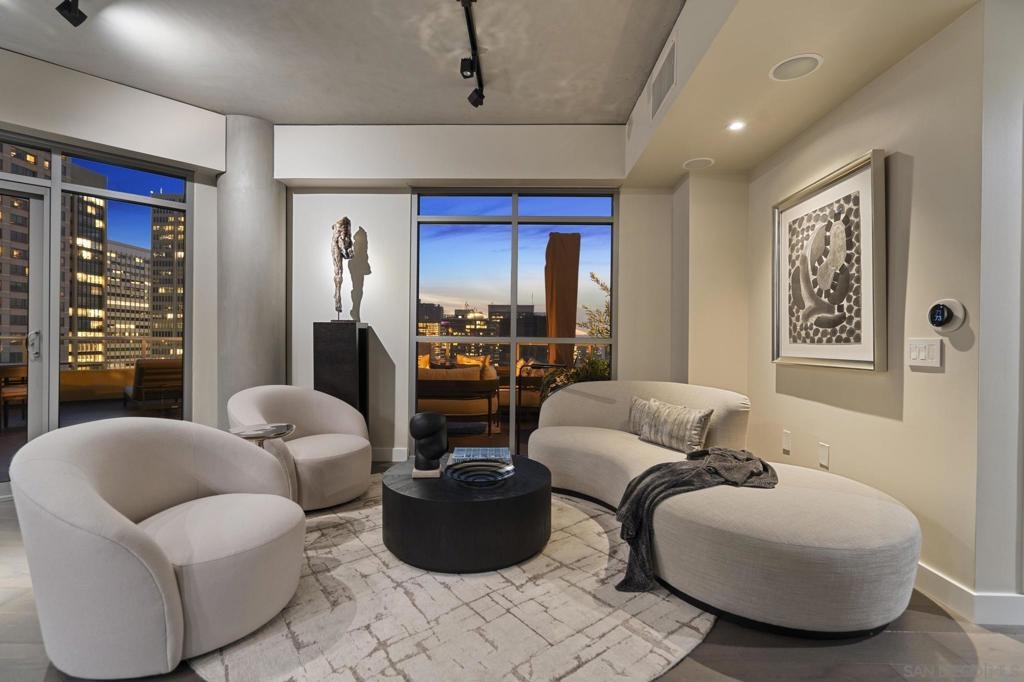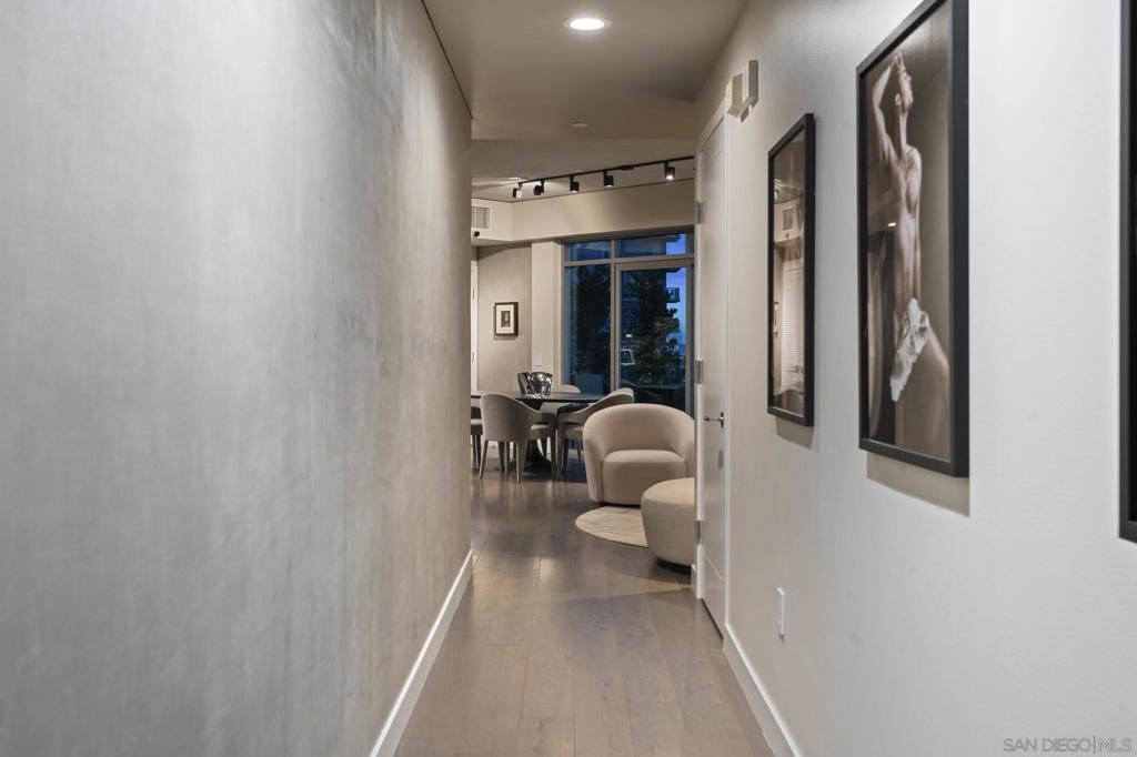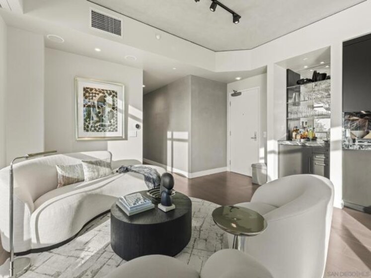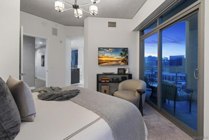Imagine waking up in the heart of vibrant downtown, where every day is a new story waiting to unfold. This luxury residence at the Cortez Blu, an exclusive boutique building, isn't just a condo; it's a launchpad for an unparalleled urban lifestyle, perfectly situated just steps from Symphony Plaza, Balboa Park, Little Italy, and the Gaslamp. Step inside your eighth-floor sanctuary, a space totally redefined in 2024 to blend modern luxury with architectural distinction. The design choices are intentional and inspiring, featuring striking exposed concrete walls adding texture and an industrial-chic edge to high-quality finishes. You'll find bespoke elements everywhere, from custom cabinetry with granite tops and high-end appliances to sophisticated designer lighting and hidden tech shades. The commitment to unique architecture extends to the bathrooms, which feature fixtures by legendary Frank Lloyd Wright. The primary suite is a true retreat, offering picturesque city views through floor-to-ceiling windows and access to a private balcony. The en-suite bathroom indulges with a dual custom vanity, soaking tub, wet room, and walk-in closet. But the real showstopper is the over 750 sq. ft. private view terrace—a rare, almost impossible-to-duplicate outdoor space that seamlessly transforms your living experience. It's your personal stage for entertaining guests or simply soaking in continual, breathtaking city vistas. This turnkey property, complete with secure parking and storage, offers a lifestyle that is both sophisticated and thrilling in the pulsating center of the city. One must experience this residence to understand the feel and tranquility it brings. Enjoy the privacy of only 2 neighbors on your floor with only a small, shared wall. Perched atop the serene Cortez Hill, Cortez Blu offers the idyllic location in Downtown San Diego, coupling urban convenience with neighborhood charm. This location affords quick access to freeways, putting the entire city in easy reach, but near all the verve and excitement of the cultural and brimming nightlife, sporting events, and social happenings of the downtown area.