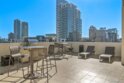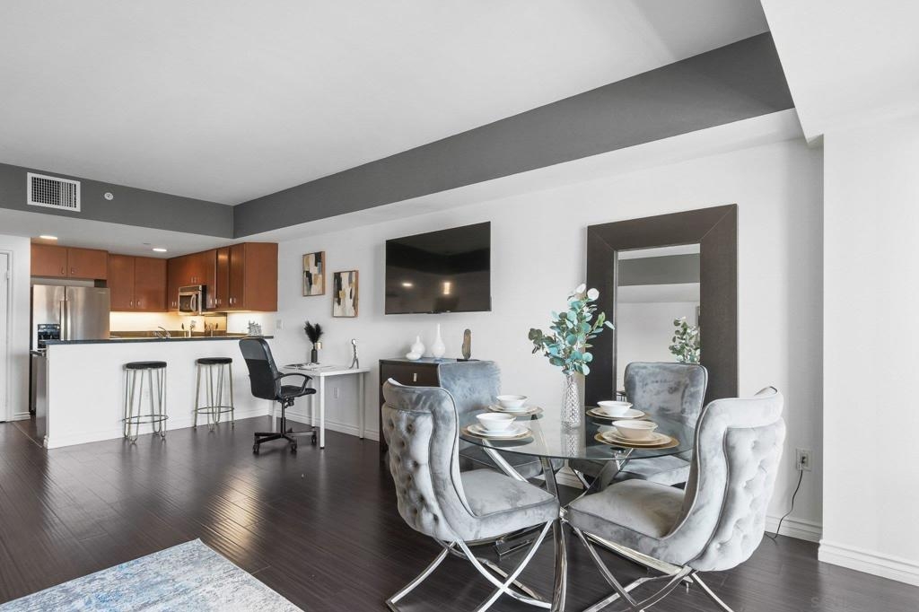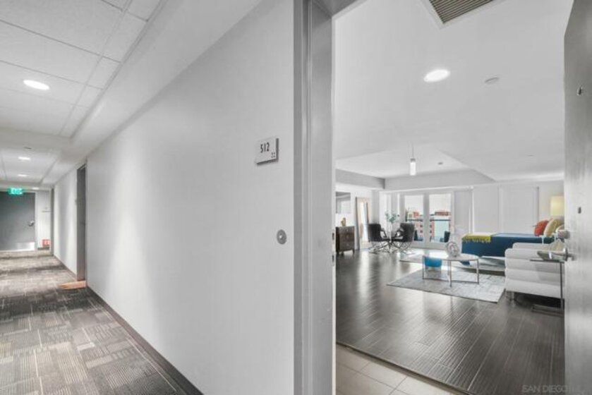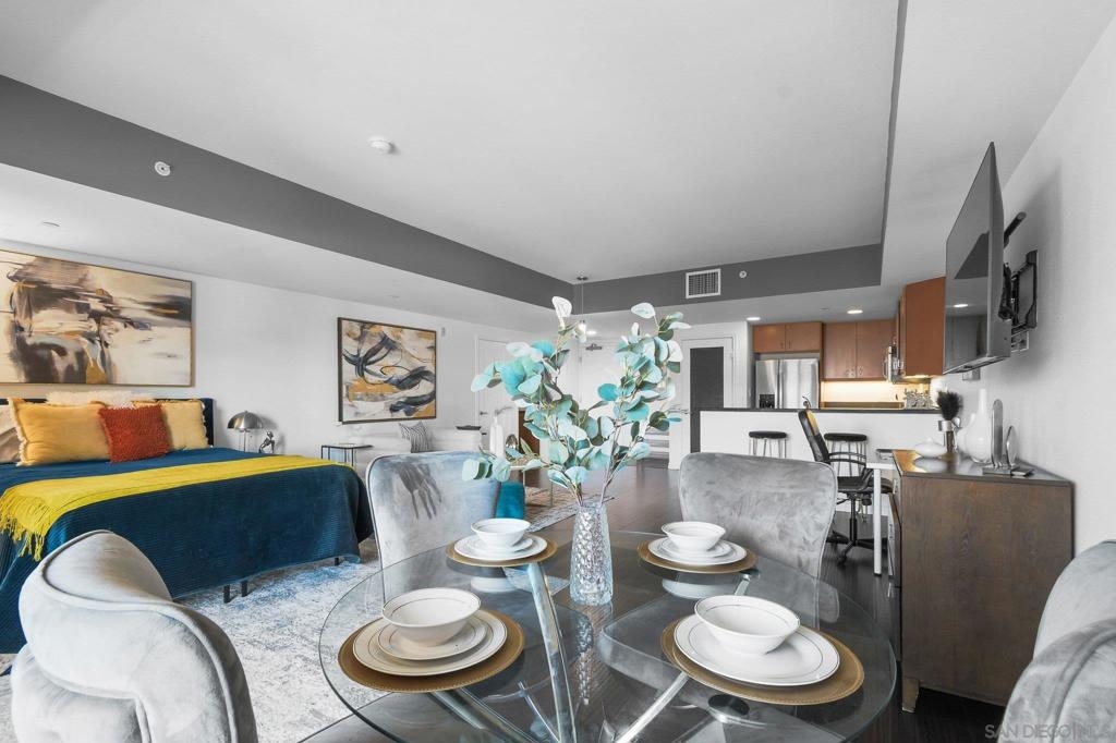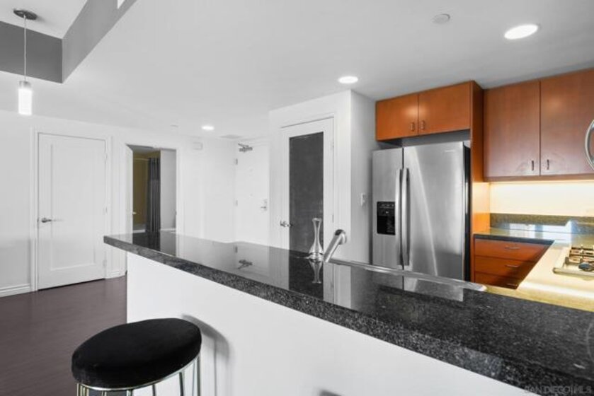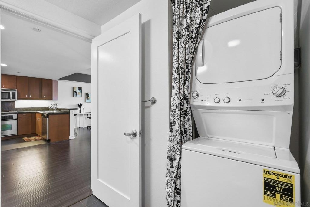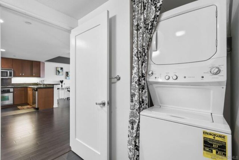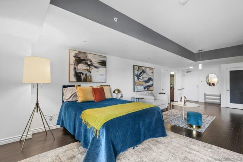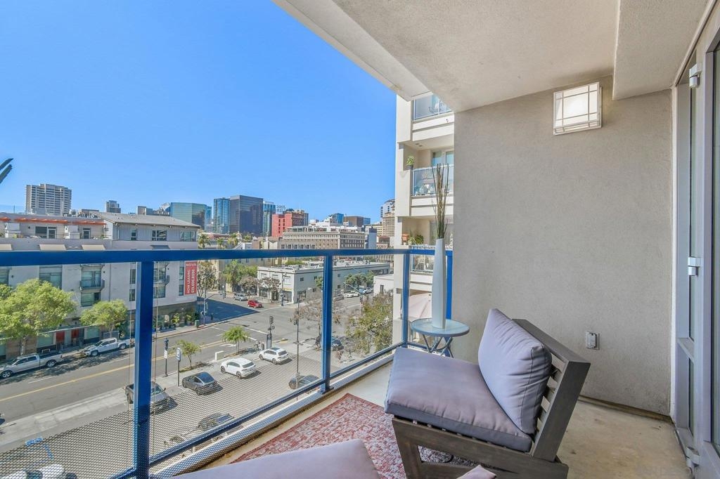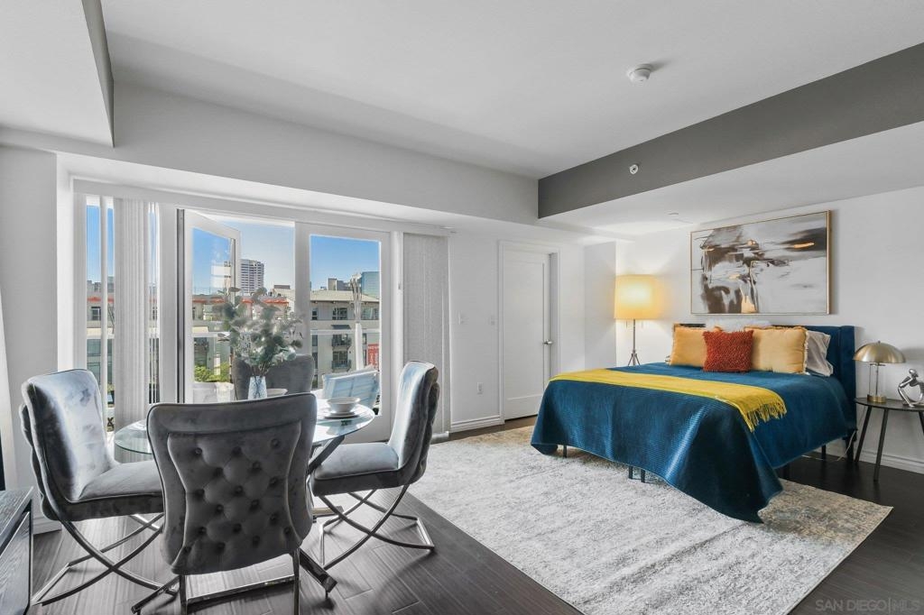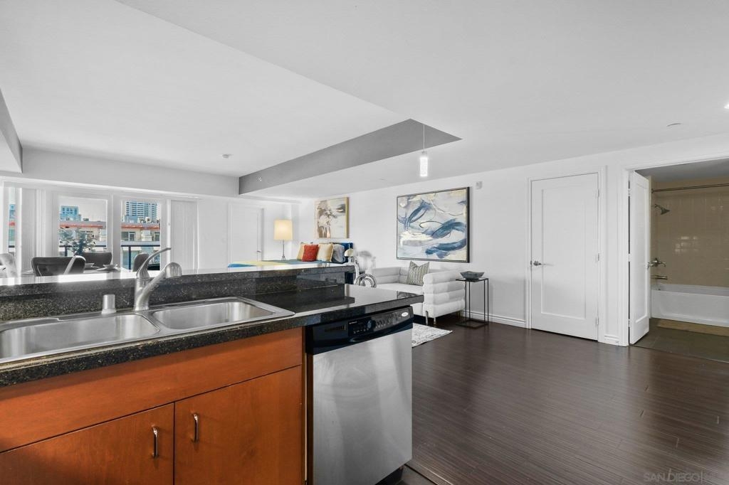 Exceptional location with walking distance to Petco Park, the Convention Center, Gaslamp, and more! This spacious 760 sq ft studio on the 5th floor features a modern kitchen with granite countertops, tile, and laminate wood flooring, and stainless steel appliances. Enjoy beautiful city views from the balcony accessed through a glass slider. The bathroom includes laundry hookups, and the unit is equipped with a rare walk-in closet, adding to its appeal. Larger than most 1-bedroom condos, this unit also comes with an assigned parking space. Upon stepping outside, you'll find the ambiance open, clean, and airy. The building is meticulously maintained and offers a fantastic gym with an open floor plan. This building sits in a great location, low density corner. Don't miss this incredible opportunity!